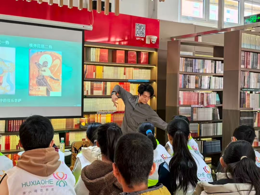 象征力量與威嚴(yán)的龍爪、代表溫柔與善良的鹿角、來源于壁畫形象的佛手……衡水學(xué)院教師、中國舞蹈最高獎(jiǎng)“荷花獎(jiǎng)”金獎(jiǎng)獲得者李山騰,為觀眾講述敦煌舞的起源,教授敦煌舞手勢,并現(xiàn)場展示經(jīng)典舞姿,將一個(gè)瑰麗而神秘的敦煌世界呈現(xiàn)在大家面前。