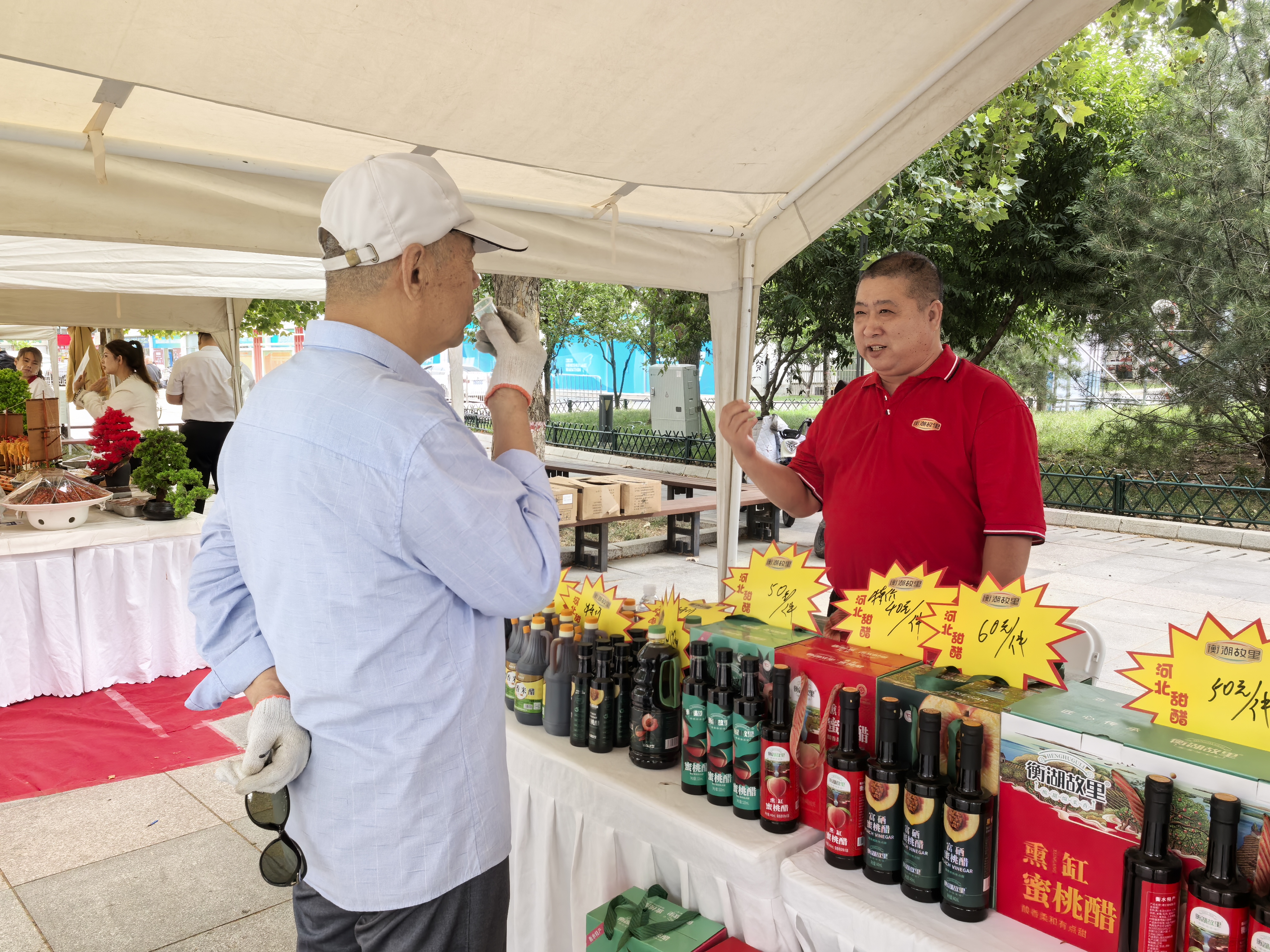 “桃香醋酸度適中,帶有淡淡桃香,適合涼拌、蘸食或炒菜調(diào)味。”桃香醋攤前的工作人員正與游人介紹。售貨員倒出少許醋液請顧客品嘗,淡淡的桃香在空氣中散開,讓人忍不住想帶上一瓶回家。
