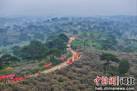 徒步愛好者在易縣清西陵松林古道健步行走。 趙駿 攝