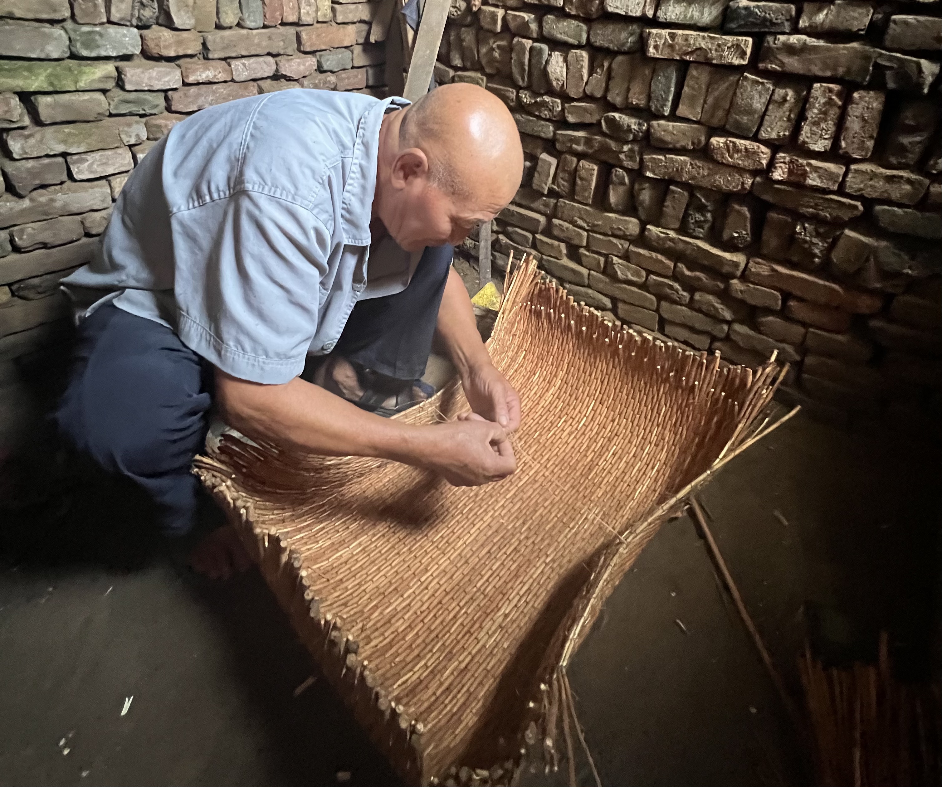 柴草堆后藏著半露的地窨子口,黑黢黢的洞口透著微涼潮氣,這是他專屬的“工作室”。“要用時再把晾干的柳條放在水里泡軟,地窨子冬暖夏涼,能一直保持柳條的濕度和柔韌性。”陳鐵抓從里面拎出一捆柳條,演示起編簸箕的步驟:左手固定幾根柳條,右手將另一根按特定紋路穿插,每一次穿插都要用力按壓,確保接口緊密。指尖翻飛間,柳條似有了生命,“這不是簡單勞作,每根柳條的穿插都得順著紋路來,就像跟它對話。”