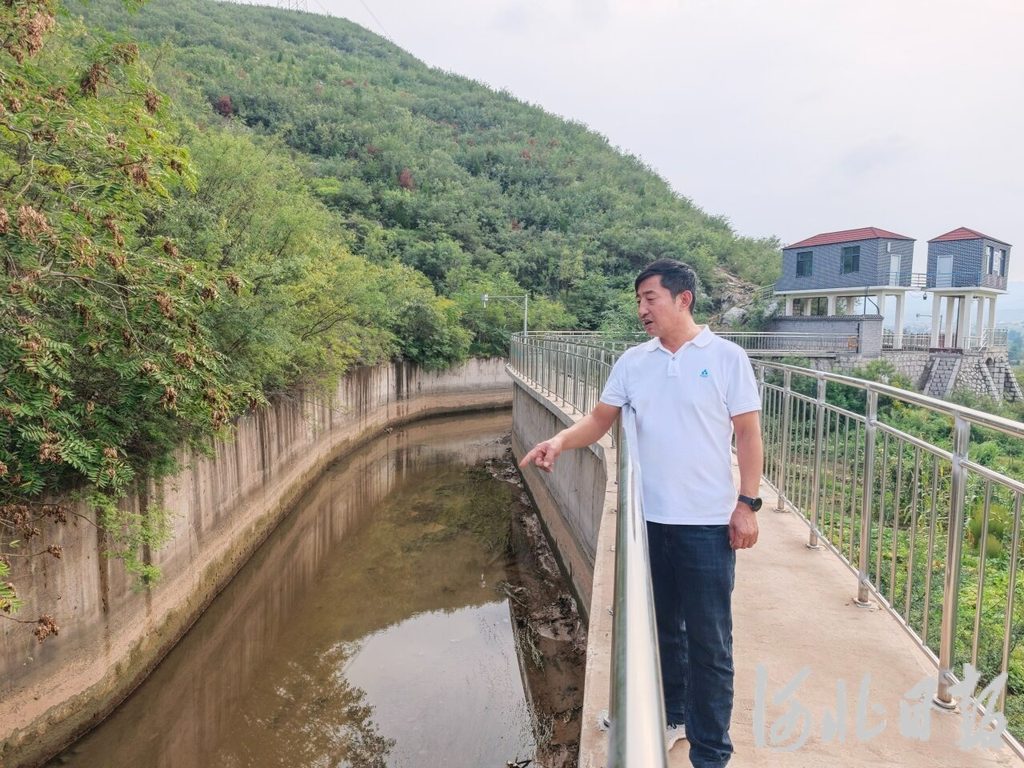 9月4日,在躍峰渠險峰渡槽附近一處渠道,躍峰渠管理處調水科科長邢彥生介紹調水情況。河北日報記者魏雨攝