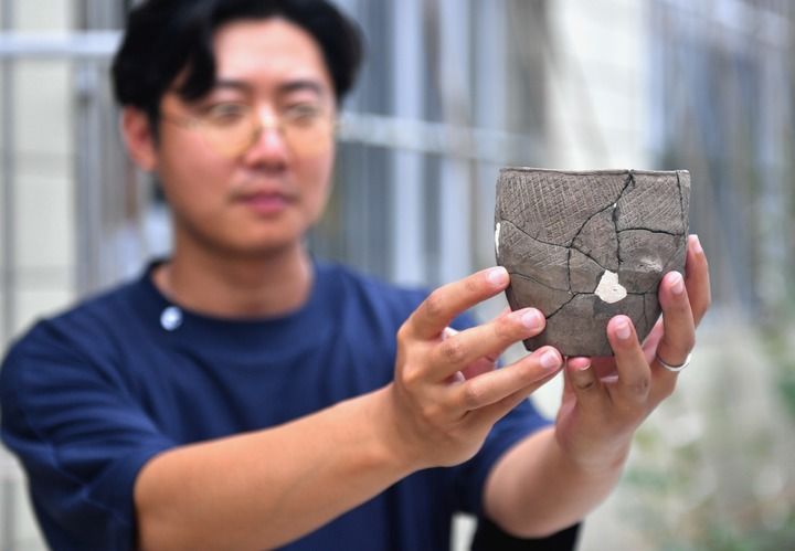 宣化鄭家溝遺址考古發(fā)掘項(xiàng)目執(zhí)行領(lǐng)隊(duì)龔湛清在展示出土的筒形罐。新華社記者王曉攝
