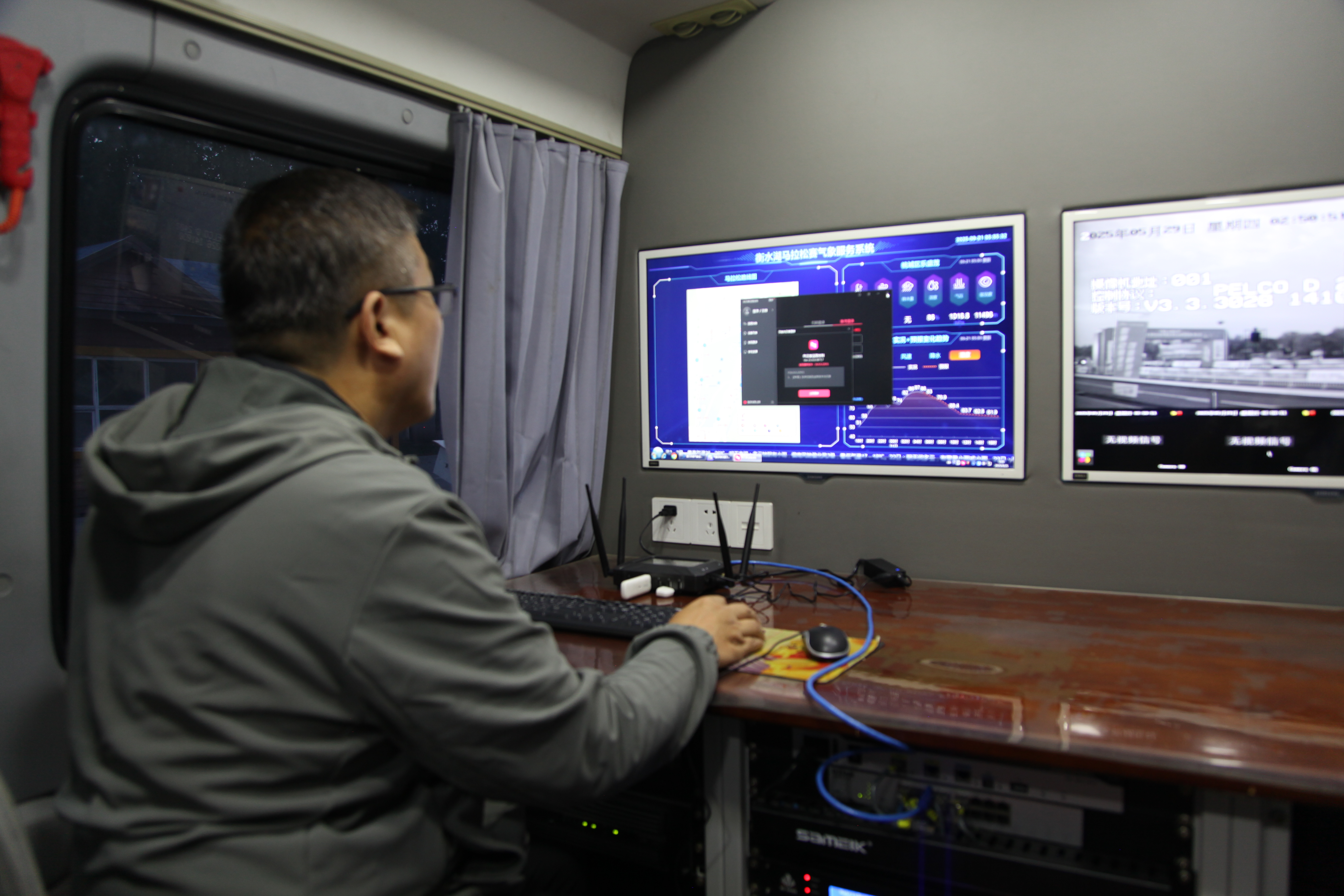 衡水氣象服務人員在應急指揮車內調試馬拉松保障服務系統。 王玄宇攝