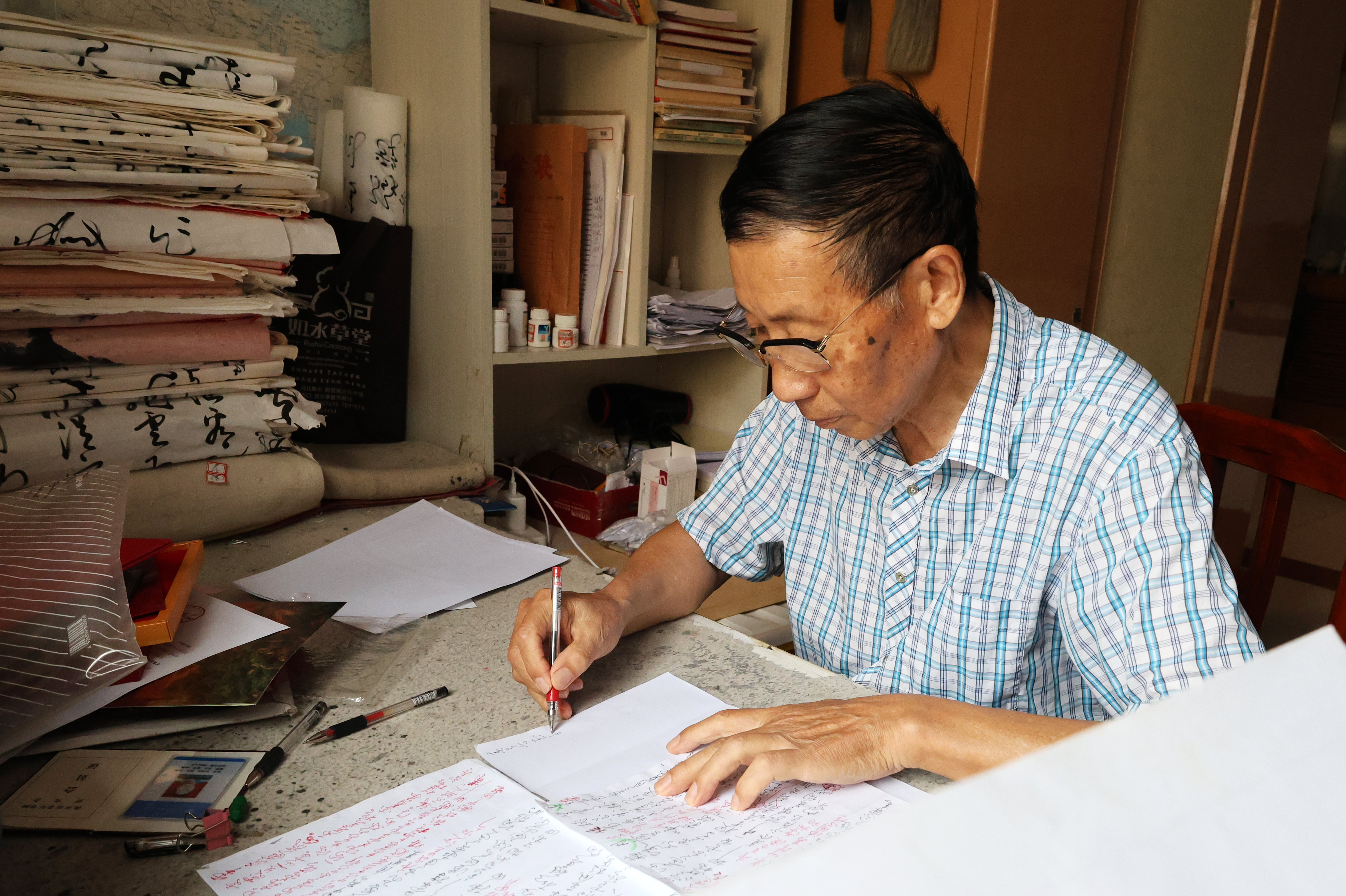 記者在他的臥室書桌上看到,桌子的最里側堆放著一米多高的宣紙作品,每一張都疊得整齊,旁邊還放著同樣高度的草稿紙,密密麻麻的字跡上,紅筆修改痕跡清晰可見。“這些都是近十年練的,床底下也裝滿了書法作品。”封錦湘笑著說,為打磨技藝,他從不在乎筆墨消耗,“能把草書寫好,這點投入不算啥”。