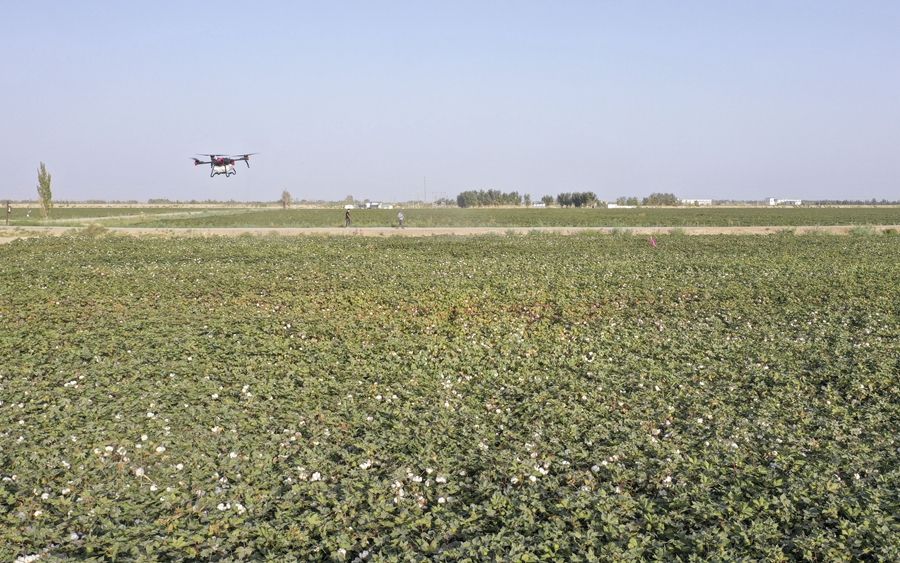 在新疆尉犁縣興平鎮達西村一處高標準農田,種植戶用無人機噴灑脫葉劑(2022年9月20日攝,無人機照片)。新華社發(汪志鵬 攝)