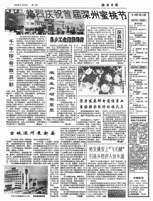 1981年1月8日至11日,“行署召開了我區(qū)歷史上第一次果樹生產(chǎn)會議”,號召全區(qū)人民動員起來,大力發(fā)展果樹生產(chǎn)(1981年1月13日《衡水日報》1版)。1983年,阜城鴨梨產(chǎn)量突破1600萬斤,創(chuàng)下歷史最高紀錄(1983年9月7日1版);1986年9月10日《衡水日報》報道了深州蜜桃品嘗推銷會在京舉辦的盛況:“昆侖飯店500元以上一桌的宴會才上蜜桃,平均5元一個?!边@些報道成為衡水特色果品第一次騰飛的生動見證。到了1987年,衡水全區(qū)果樹面積已達50萬畝,與改革開放前相比,產(chǎn)量、產(chǎn)值均翻兩番以上。深州蜜桃、阜城鴨梨、武邑黃口大棗、棗強馬蓮小棗、故城冬棗5個名特優(yōu)稀果品商品生產(chǎn)基地已見雛形,正向商品化發(fā)展。