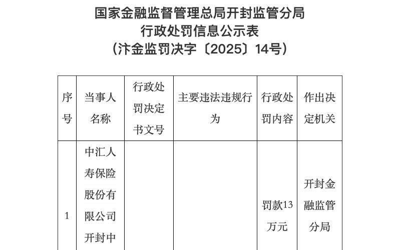 而在此前的4月14日,國家金融監督管理總局吉林監管局發布行政處罰信息顯示,中匯人壽四平中心支公司及其時任總經理初哲被罰,主要違法違規行為是組織員工利用朋友圈以保險產品即將停售為由進行宣傳銷售。針對上述違法違規行為,監管部門對中匯人壽四平中心支公司處以6萬元罰款;對直接責任人初哲給予警告,并處1.5萬元罰款。