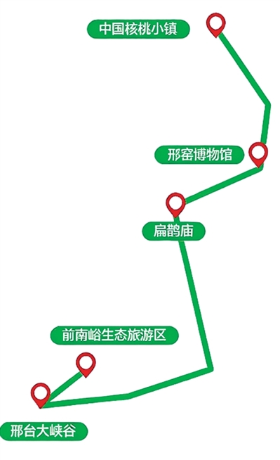 線路:中國(guó)核桃小鎮(zhèn)—崆山白云洞—邢窯博物館—扁鵲廟—邢臺(tái)大峽谷—英談村—抗大陳列館—前南峪生態(tài)旅游區(qū)