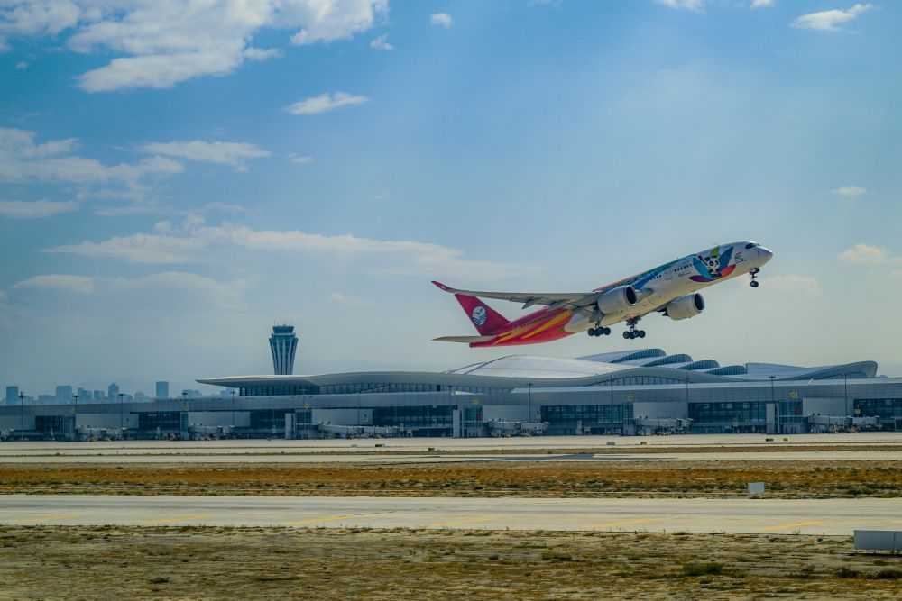 9月15日,一架飛機(jī)從烏魯木齊天山國際機(jī)場起飛。新華社記者 陳朔 攝