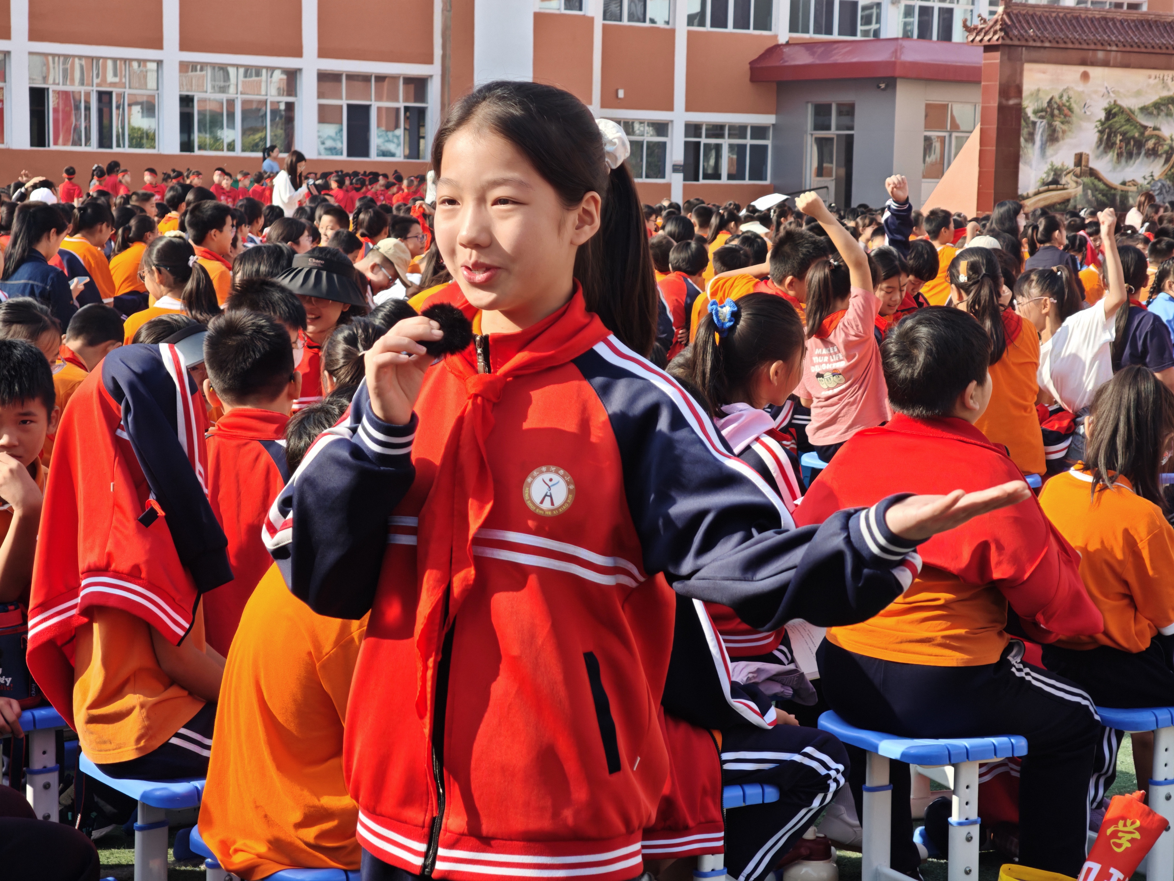 “你們瞧,操場里坐得滿滿當當的,同學們都整整齊齊地坐著,小眼睛亮晶晶地盯著前面的舞臺,有的還悄悄地攥著小拳頭,和我一樣期待呢!”河西小學衡報文明小記者王思睿在現場報道?!巴瑢W們,有沒有想送給祖國的祝福呀?”現場的學生們齊聲喊道:“祝祖國媽媽生日快樂!”