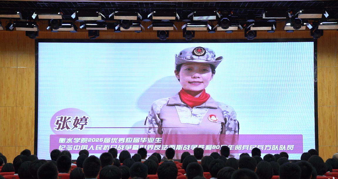 現(xiàn)場(chǎng)兩段特別視頻的呈現(xiàn),更為宣講活動(dòng)注入了深沉的情感力量。紀(jì)念中國(guó)人民抗日戰(zhàn)爭(zhēng)暨世界反法西斯戰(zhàn)爭(zhēng)勝利80周年閱兵民兵方隊(duì)隊(duì)員、衡水學(xué)院2025屆優(yōu)秀畢業(yè)生張婷,通過(guò)視頻與師生們分享了她與戰(zhàn)友一同英姿颯爽走過(guò)天安門廣場(chǎng)、接受黨和人民檢閱的光榮經(jīng)歷,展現(xiàn)了新時(shí)代青年傳承紅色基因、賡續(xù)精神血脈的堅(jiān)定信念與昂揚(yáng)風(fēng)采。另一段視頻的主人公是來(lái)自故城縣的百歲老兵李林昌,他15歲參軍,1942年加入冀中九分區(qū)敵后武工隊(duì),更是長(zhǎng)篇小說(shuō)《敵后武工隊(duì)》中“小李子”的人物原型。戰(zhàn)爭(zhēng)年代,他身經(jīng)百戰(zhàn)、三次“犧牲”又奇跡生還,歷經(jīng)九死一生。視頻中,這位百歲老兵精神矍鑠、語(yǔ)重心長(zhǎng),他的殷殷囑托,深深叩擊著在場(chǎng)每一位聽(tīng)眾的心靈。