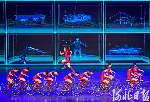 9月28日,河北省雜技團演員正在吳橋江湖大劇院表演《雛鳳凌空—— 女子集體車技》。 河北日報記者 李東宇攝