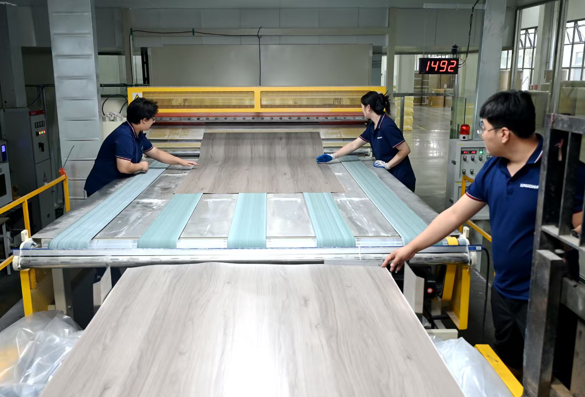 這邊,圣奧計劃專員在電腦上點下訂單確認鍵沒多久。那邊,金帝車間的生產線已高速運轉,既定規格的三聚氰胺浸漬膠膜紙不停下線,被工人麻利地碼成齊整垛堆。當日傍晚,這批材料便從金帝廠區出發,由叉車直接送進圣奧的板材加工車間。