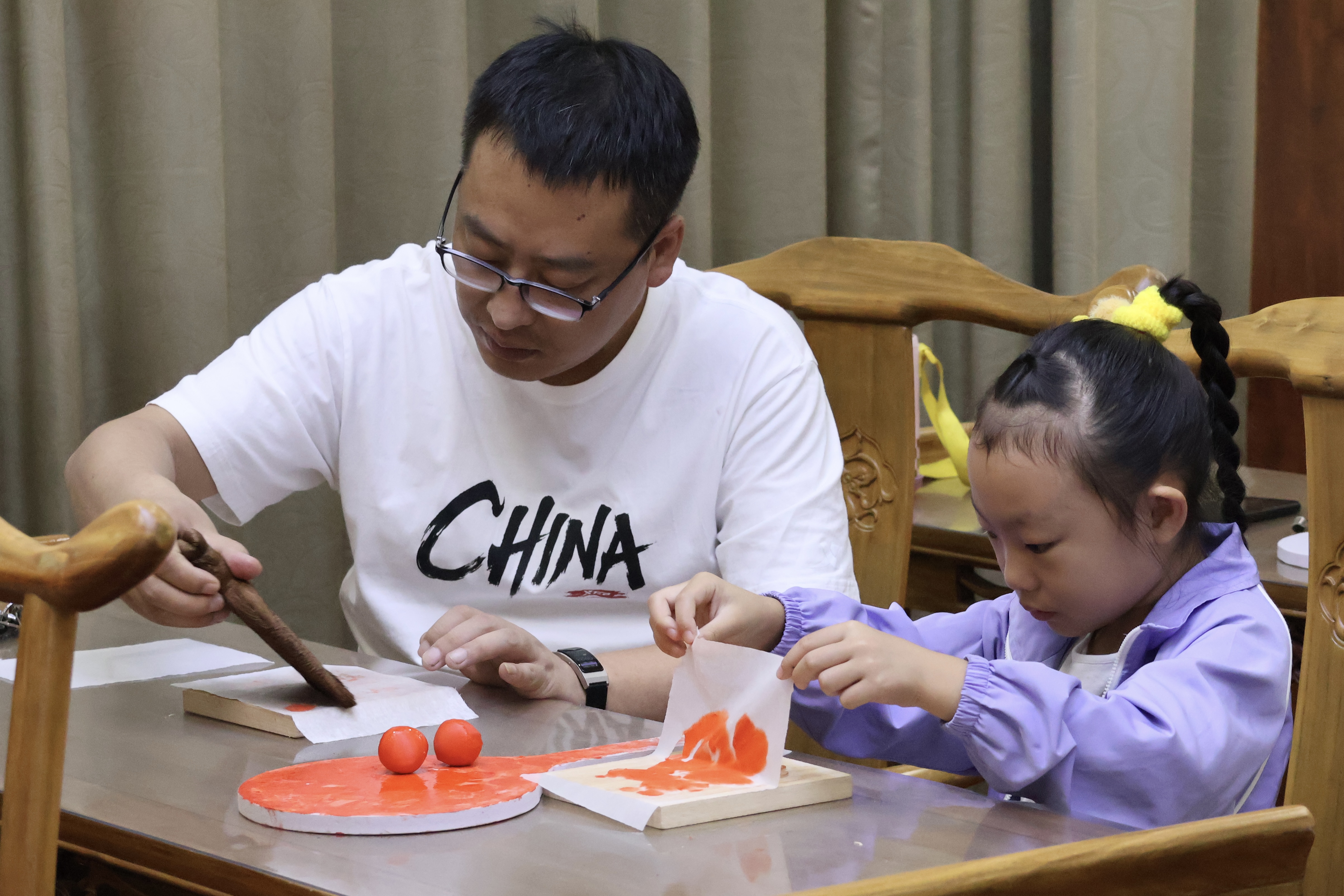 講解結束后,體驗活動隨即展開。孩子們在家長的陪伴下,紛紛領取工具,按照步驟動手嘗試。有的小心翼翼鋪開宣紙,有的在老師指導下調整墨量,還有的屏息凝神用拓包捶打,現場墨香與歡聲笑語交織。“快看,這是我做的!等回去后我要向我的伙伴們展示,讓他們也看看非遺有多厲害!”小朋友季佳嫻舉著自己拓印的作品驕傲地說。