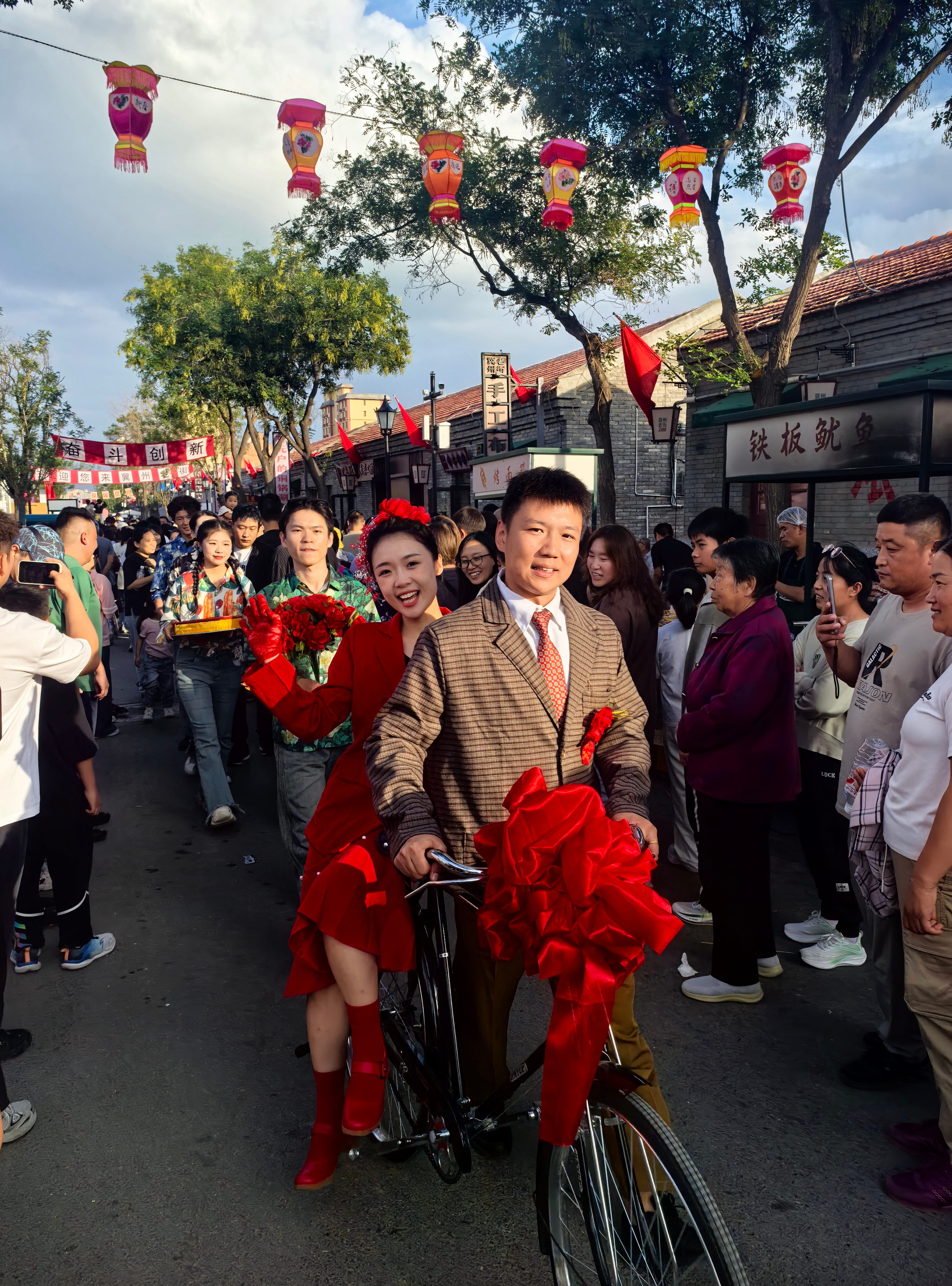 街頭紅旗招展,“熱烈歡迎您來冀州老街”的橫幅下人頭攢動。樂隊現場獻唱、復古快閃舞活力四射,還有還原年代感的婚俗巡游,新人騎著老式自行車穿行于人群中。供銷社風格市集里,懷舊零食、復古文創(chuàng)琳瑯滿目,大人孩子在充滿年代感的場景中穿梭選購。更有特色花車表演,演員以復古造型演繹時代風情。