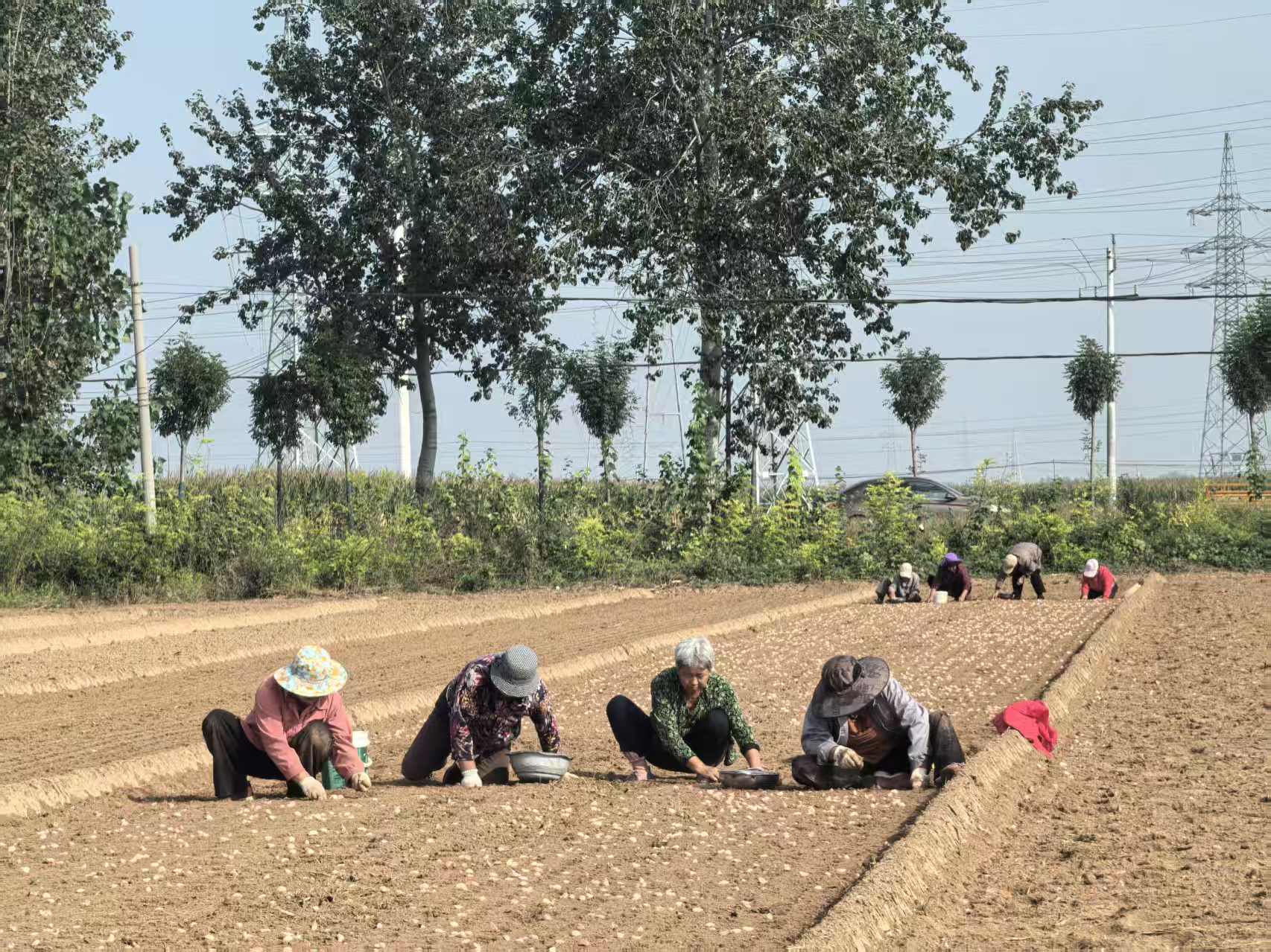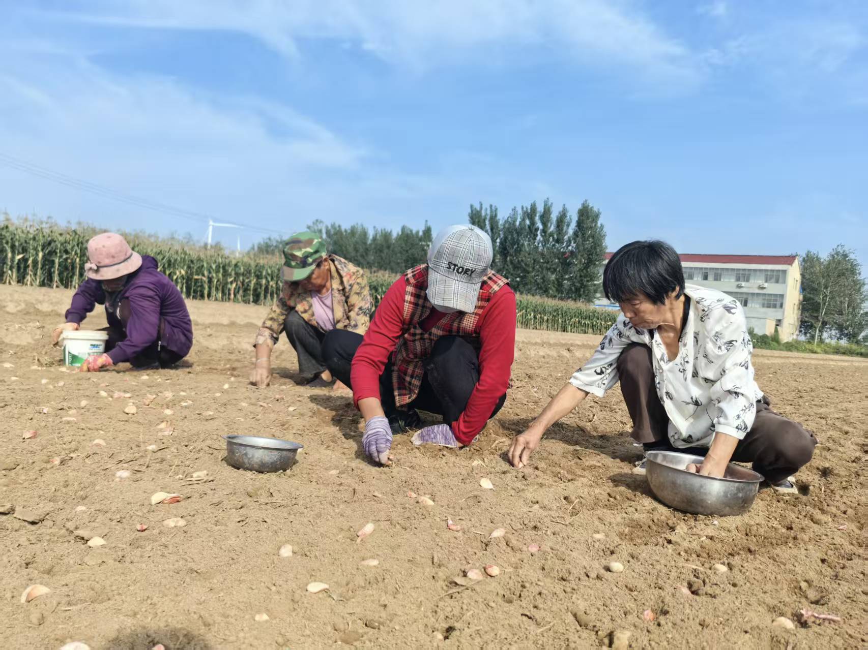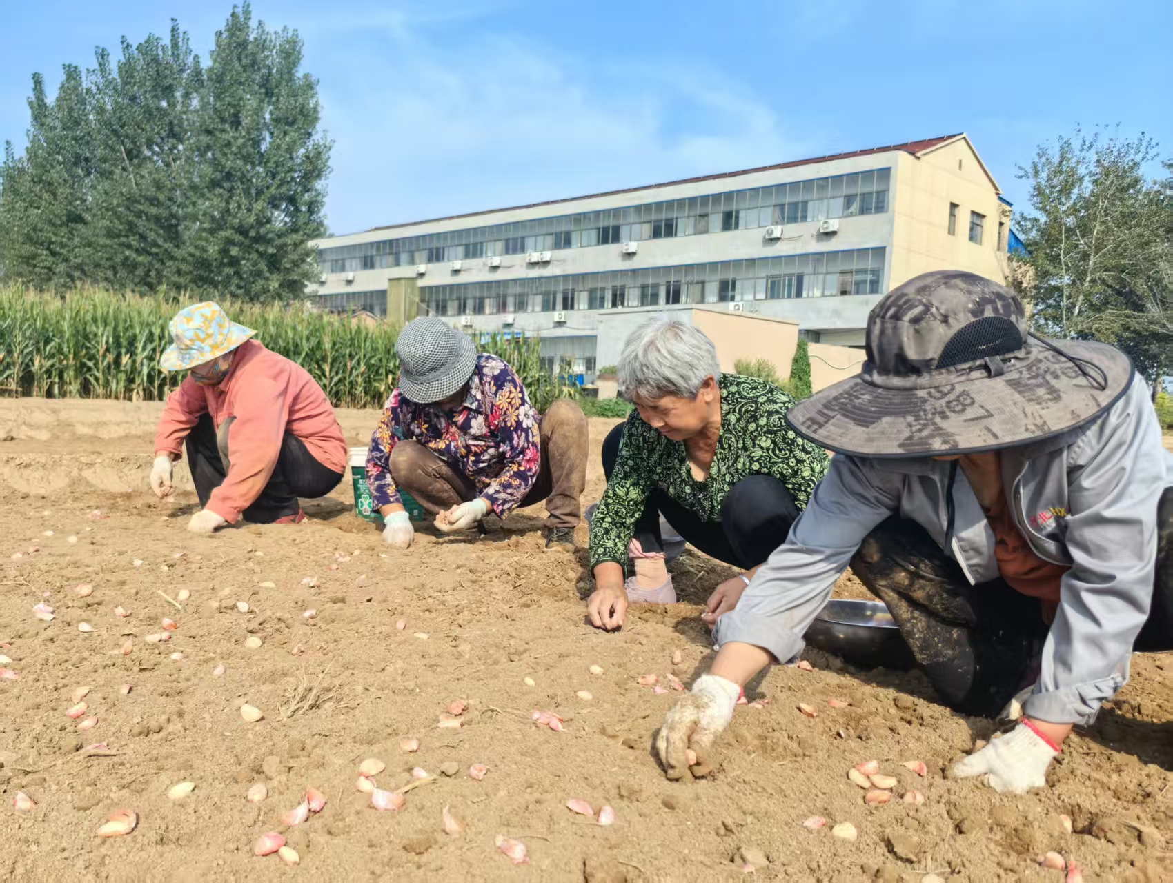 大蒜作為一種勞動密集型栽培作物,從種植前期的準備工作到后期的收獲都需要足夠的勞動力。這不僅拓寬了集體增收渠道,還為周邊村民帶來了就業機會,僅在大蒜種植階段每天就需要20余人的勞動力?!拔覀兗矣衩锥际胀炅耍诩乙矝]什么忙的,已經來這里種了五天大蒜了,一天能掙100元”“我們都是本村村民,離家近,中午還不耽誤給孩子做飯”村民們嘴里說著話,手里的活兒卻一直沒停。