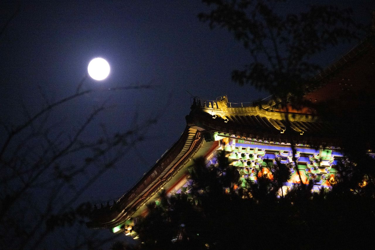 10月6日晚,定安閣檐角上的神秘“屋脊獸”與中秋圓月相映成趣。雄安媒體中心王偉倩 攝