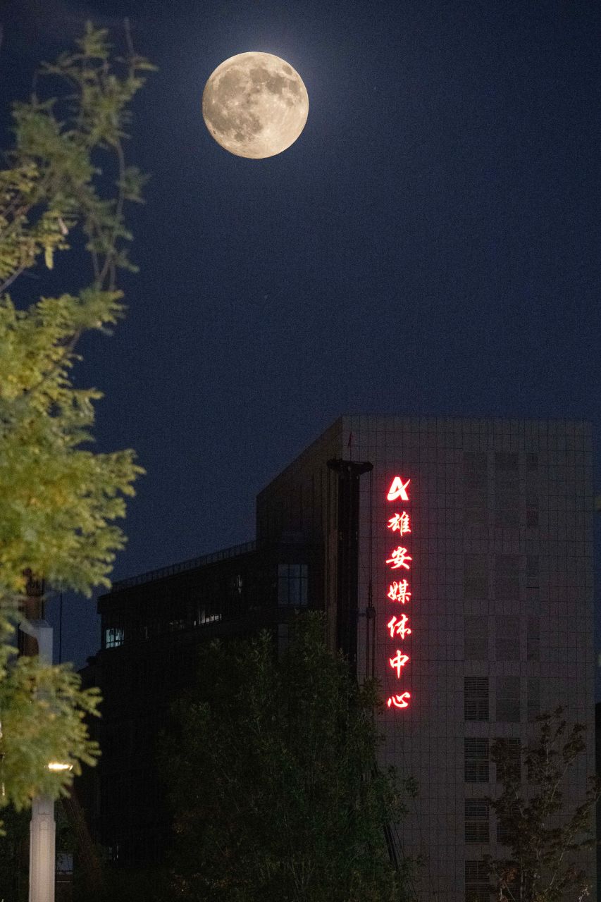 10月6日晚,中秋圓月懸掛在雄安媒體中心大樓之上。雄安媒體中心王偉倩 攝(二次曝光)
