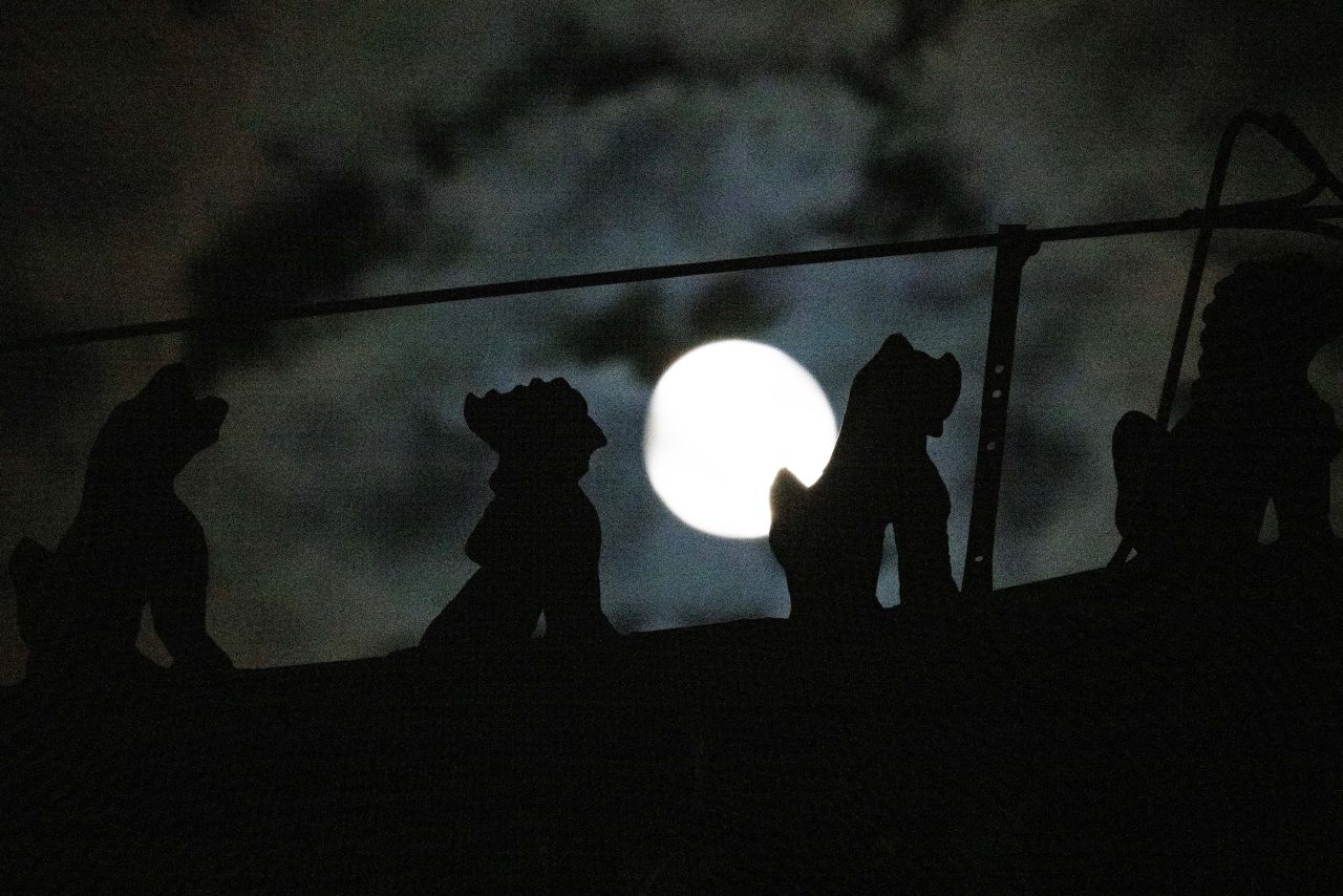 10月6日晚,定安閣檐角上的神秘“屋脊獸”與中秋圓月相映成趣。雄安媒體中心王偉倩 攝
