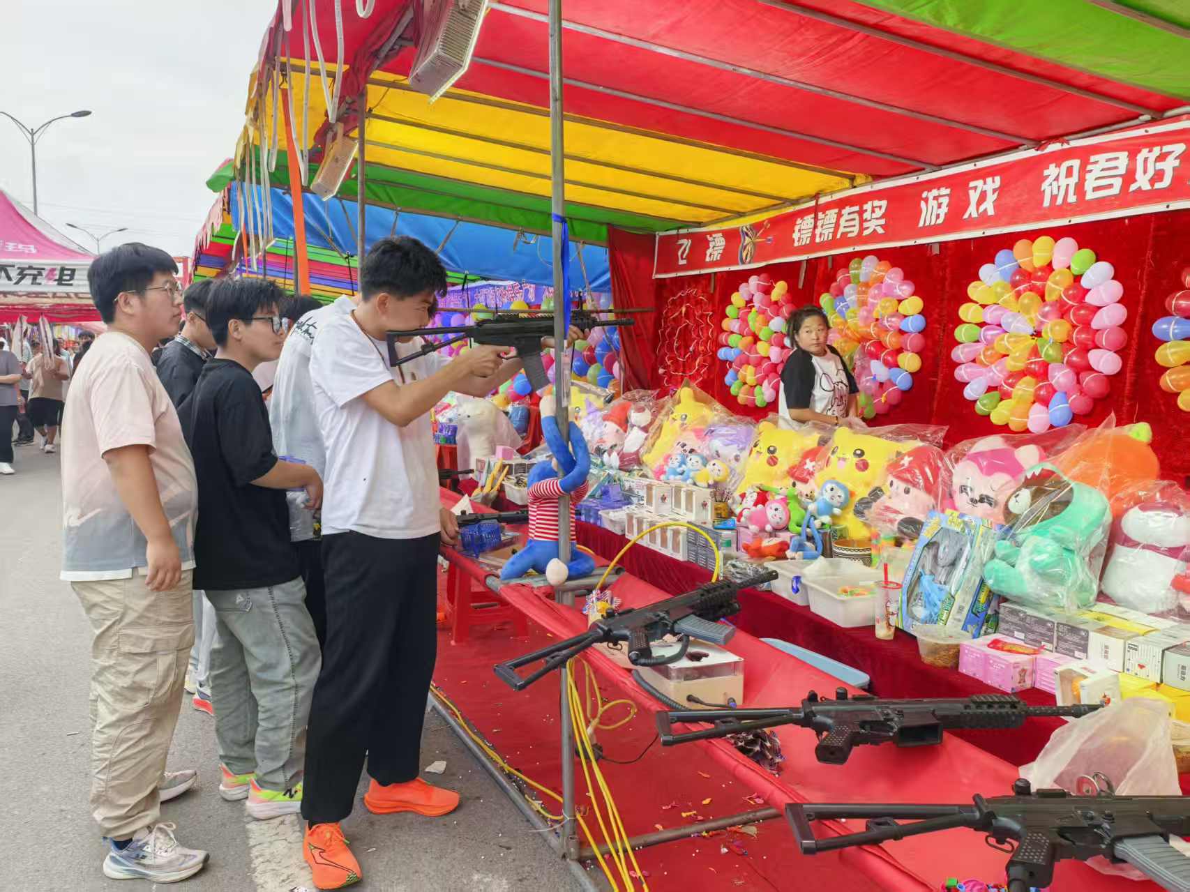 下午7時,走進廟會現場,熱鬧景象撲面而來。游戲區里,套大鵝攤位前排著長隊,大白鵝在圍欄里昂首踱步,游客們眼疾手快拋出彩圈,吆喝聲、叫好聲和鵝群的撲棱聲交織成獨特的“歡樂樂章”。不遠處的打槍攤位前,青年端著仿真玩具槍瞄準氣球陣,“砰砰”氣槍聲中,皮卡丘、大熊玩偶接連被贏走,同伴們舉著手機記錄,快門聲與笑聲不斷。