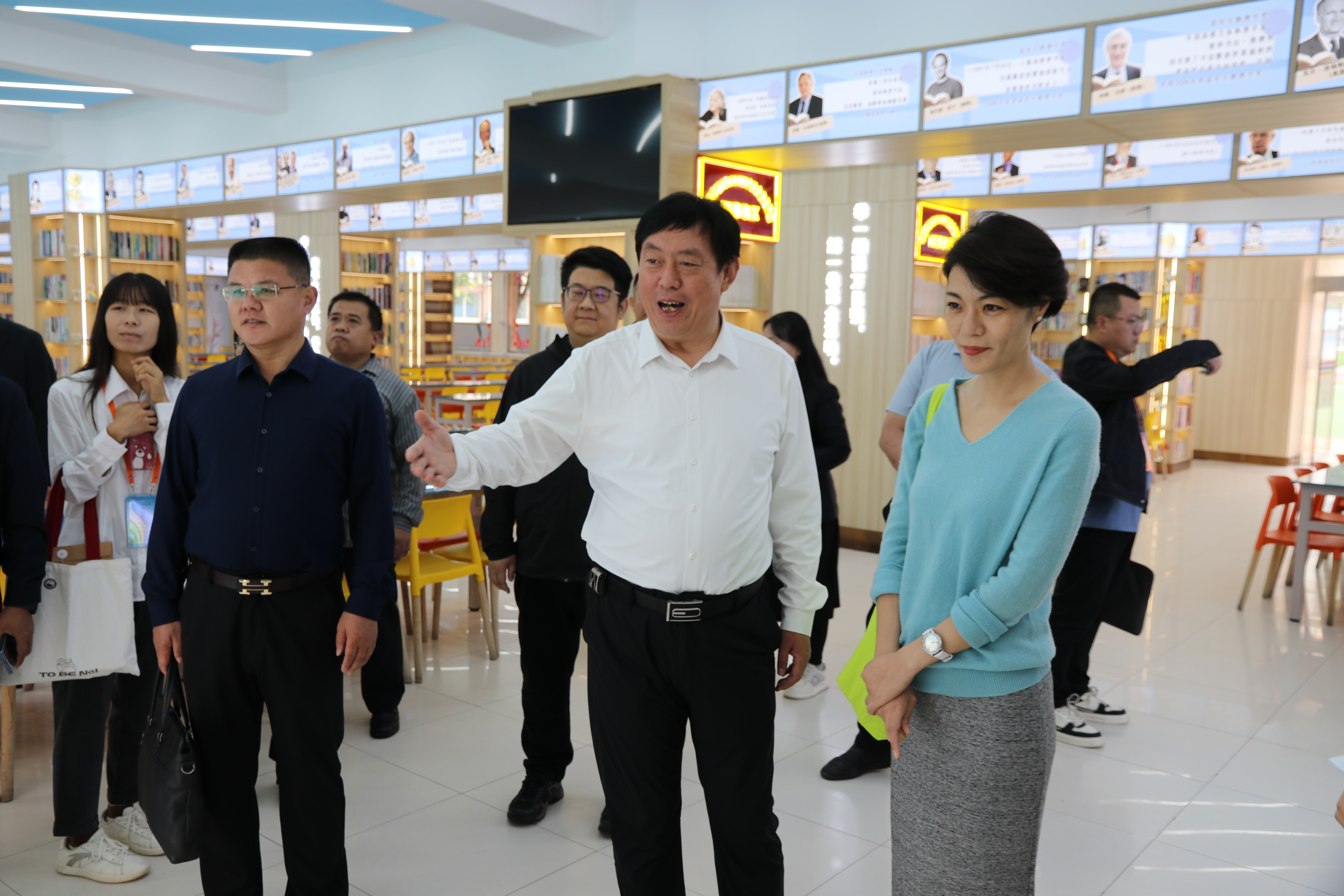衡水市教育局督學、衡水十三中黨委書記白祥友(前左)向陳果老師介紹十三中。 徐鵬璐 攝