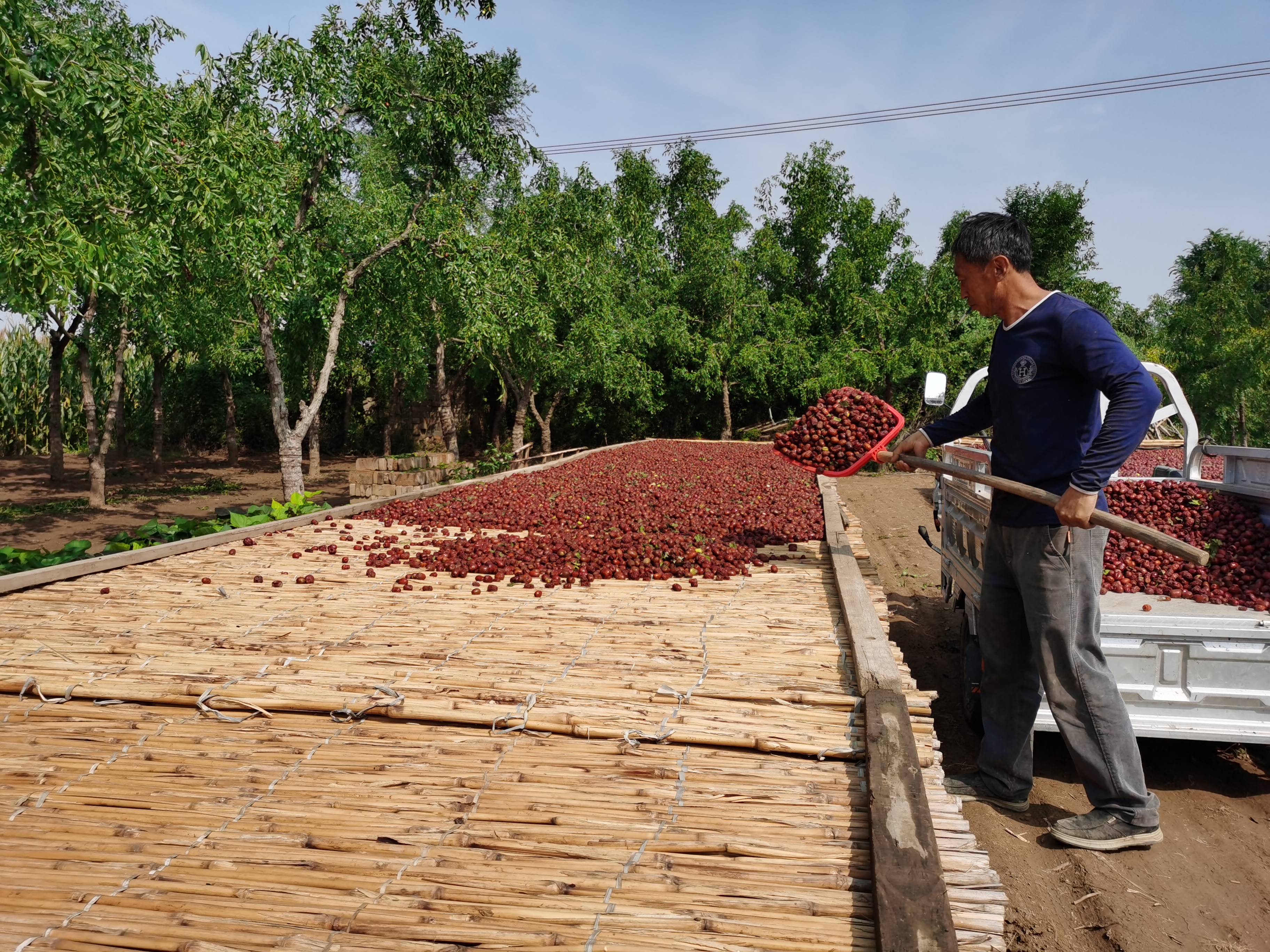 在晾曬場上,村民沈磊正把剛采下的鮮棗均勻鋪在竹席上。“上午摘,下午曬,一周就能出棗干,還能多賣錢。”陽光下,一排排紅艷艷的棗子鋪展如毯,散發出濃郁甜香。