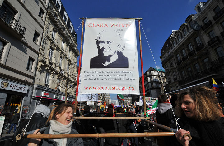 2010年3月6日,在比利時(shí)首都布魯塞爾,婦女代表抬著著名女政治活動(dòng)家、三八國(guó)際婦女節(jié)的倡導(dǎo)者克拉拉·蔡特金的畫像參加慶祝三八國(guó)際勞動(dòng)?jì)D女節(jié)游行。新華社記者 武巍 攝