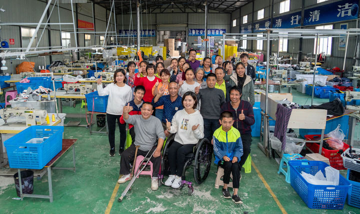 2020年10月13日,在湖南省邵陽市城步縣湖南七七科技股份有限公司生產(chǎn)車間,楊淑亭(前排中)與工友合影。新華社記者 才揚(yáng) 攝
