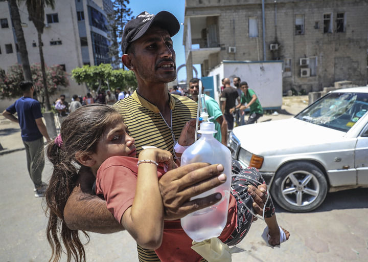 2025年7月13日,在加沙城一所醫(yī)院,一名男子懷抱在以軍空襲中受傷的女孩。新華社發(fā)(馬哈茂德·扎基攝)