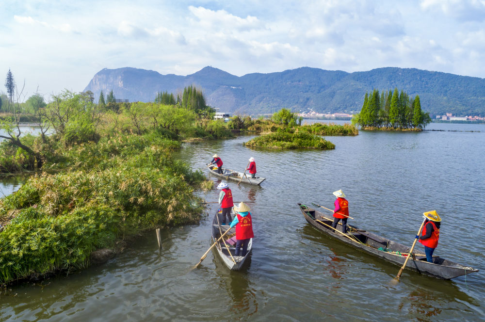 2023年3月20日,巾幗打撈隊隊員在云南昆明滇池草海打撈水草(無人機照片)。在云南昆明滇池邊,活躍著一支由當地婦女組成的巾幗打撈隊。數十年來,她們駕駛船只打撈滇池及周邊入湖河道、濕地的垃圾、雜草等。
