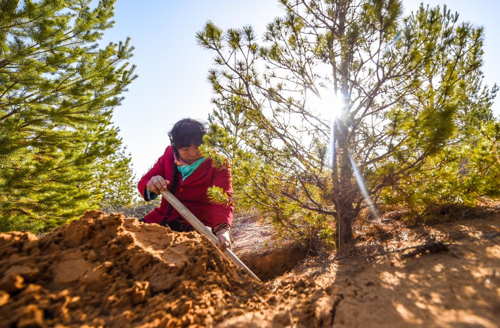 2021年3月23日,殷玉珍在內蒙古毛烏素沙漠挖土,查看松樹根部的生長情況。20世紀80年代,殷玉珍嫁到這片沙地時,眼前只有漫無邊際的黃沙。1986年,她埋下第一棵樹苗,從此與風沙較勁。如今,7萬多畝荒沙披上了綠裝,治理好的土地上種起了小米,金燦燦的谷穗成了“沙漠黃金”。