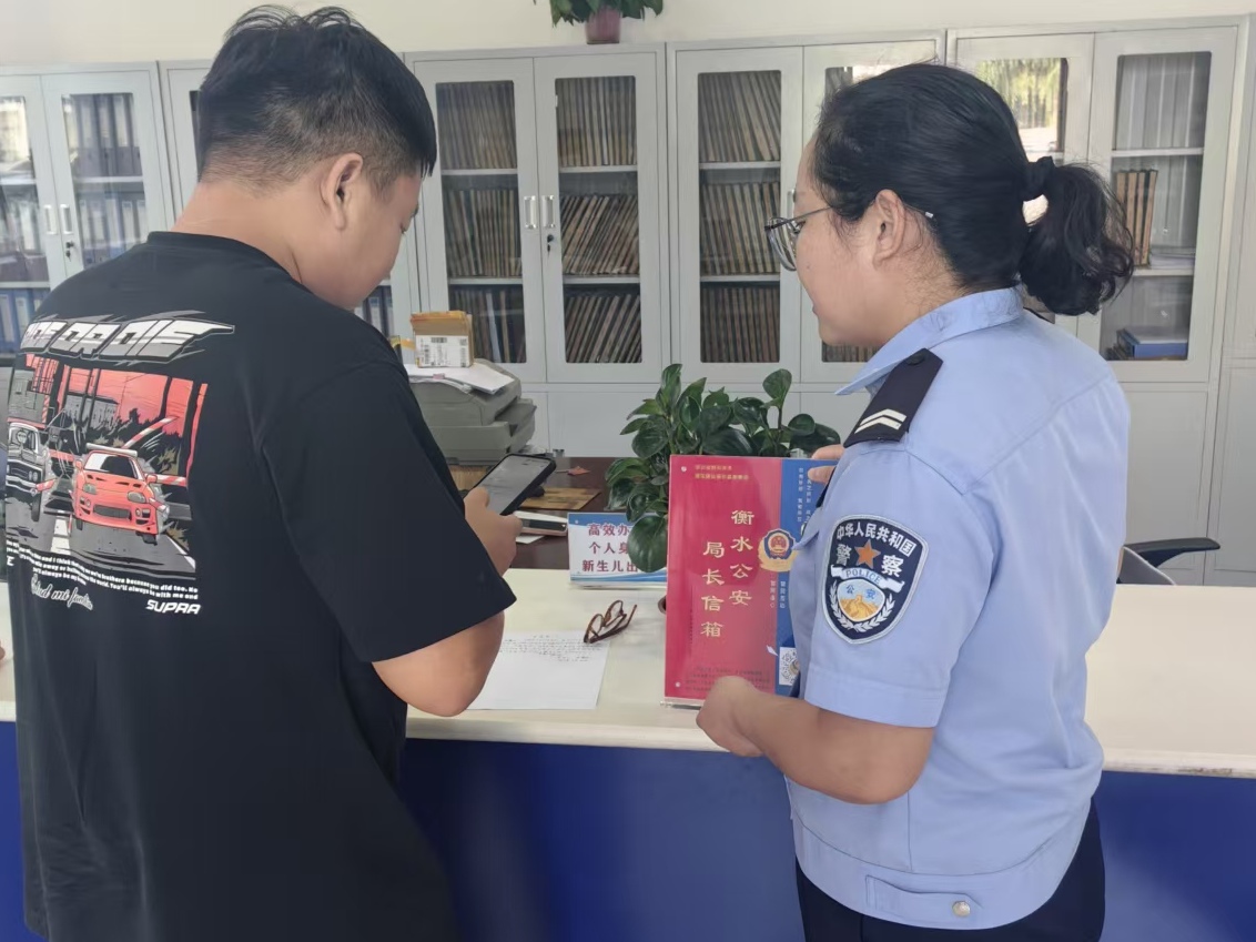 饒陽縣公安局將“局長信箱”宣傳融入窗口服務(wù)全流程,在政務(wù)服務(wù)大廳、交警車駕管窗口及各派出所戶政窗口等群眾辦事集中的場所,把設(shè)計醒目的宣傳立牌精準(zhǔn)擺放在取號臺、等候區(qū)等顯眼位置。前來辦證的群眾在民輔警的介紹下,直面地了解饒陽公安“局長信箱”平臺的相關(guān)常識、使用方法等,受到群眾的歡迎。