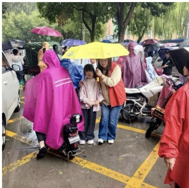 一把“彩虹傘”,筑起校園安全通道。中午時分,志愿者們早已在學校門口就位。他們手中撐起的雨傘,連成了一道比彩虹更堅固的“愛心橋”。“小朋友,慢一點,注意水坑!”一位志愿者一邊輕聲提醒,一邊熟練地扶住學生身后滑落的書包,并將其安全護送至家長車上。盡管褲腳已被雨水浸濕,他們的目光卻始終追隨著一個個年幼的身影,充當“移動路標”引導交通、作為“臨時家長”遮風擋雨,確保了每個孩子平安、干爽離校。
