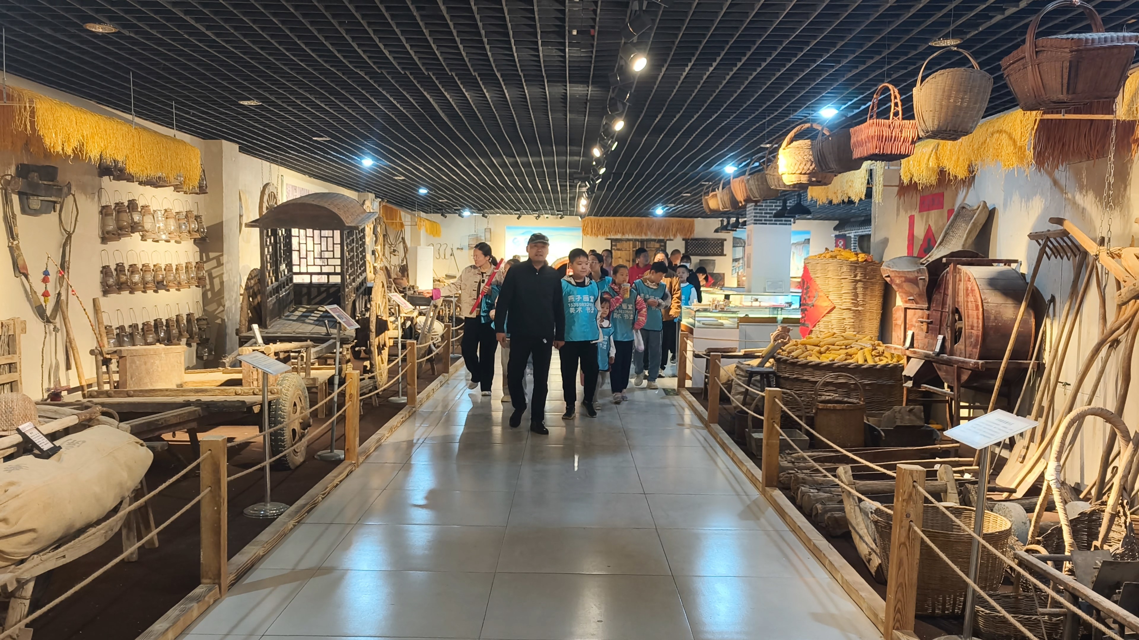 踏入民俗博物館,濃郁的傳統文化氣息撲面而來。在“農耕文明展區”,犁、耙、鐮刀等老式農具整齊陳列,舊時農家院落場景生動還原,瞬間吸引了孩子們的目光。講解員結合生動故事,詳細介紹農具用途:“這是老式脫粒機,以前農民伯伯靠它給糧食脫粒。”孩子們聽得入神,有的還忍不住伸手輕觸展品。