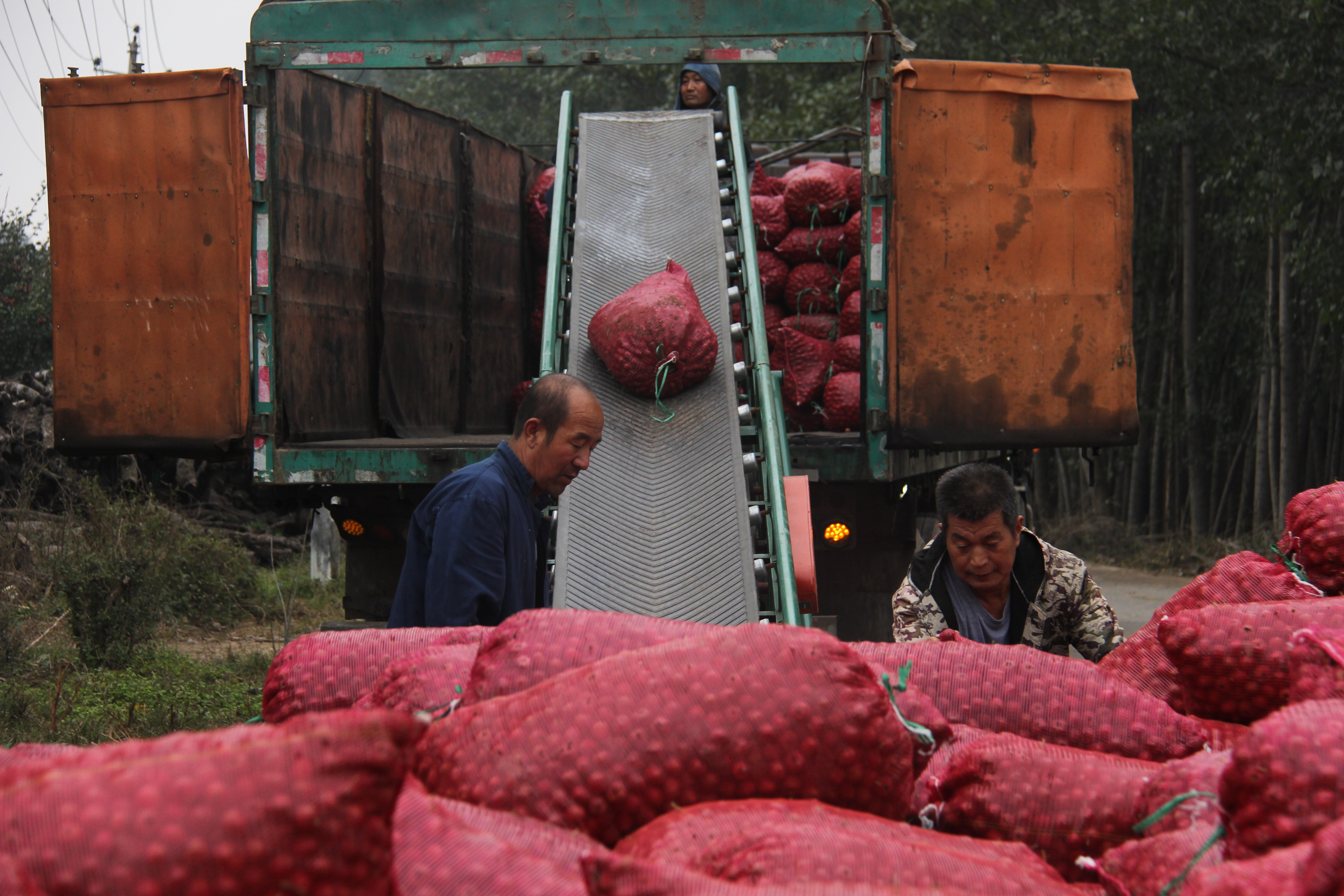 村里的小路邊,一袋袋山楂早已碼成小山,每袋都鼓脹得仿佛要撐破縫線,露出里面渾圓的山楂果實。村民們用傳送帶將一袋袋山楂裝進(jìn)貨車,“老張,把南邊那排麻袋往中間推推!”大家忙碌的身影和滿袋紅果相映成趣,一袋袋山楂在肩頭傳遞的節(jié)奏,與遠(yuǎn)處果園里此起彼伏的采收聲遙相呼應(yīng)。