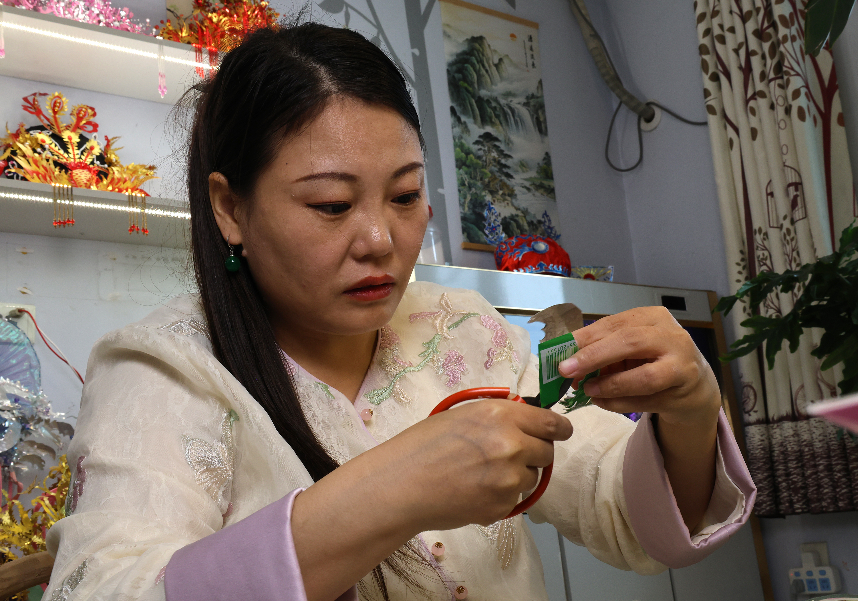 在衡水桃城區一處居民家中,20余平方米的客廳被改造成兼具創作與直播功能的小空間。37歲的王媛嬌身著素雅新中式裙裝,正對著鏡頭拆解手工技法,她手邊帽架上的鳳冠綴滿珠飾、流光溢彩——誰能想到,這件精致的傳統頭飾,原材料竟是平日里被當作廢品丟棄的易拉罐。王媛嬌將這些廢棄的易拉罐制作成各種樣式的鳳冠、頭飾、擺件等藝術品,并在網上開設了手工課,將這變廢為寶的技藝傳授給更多手工愛好者。