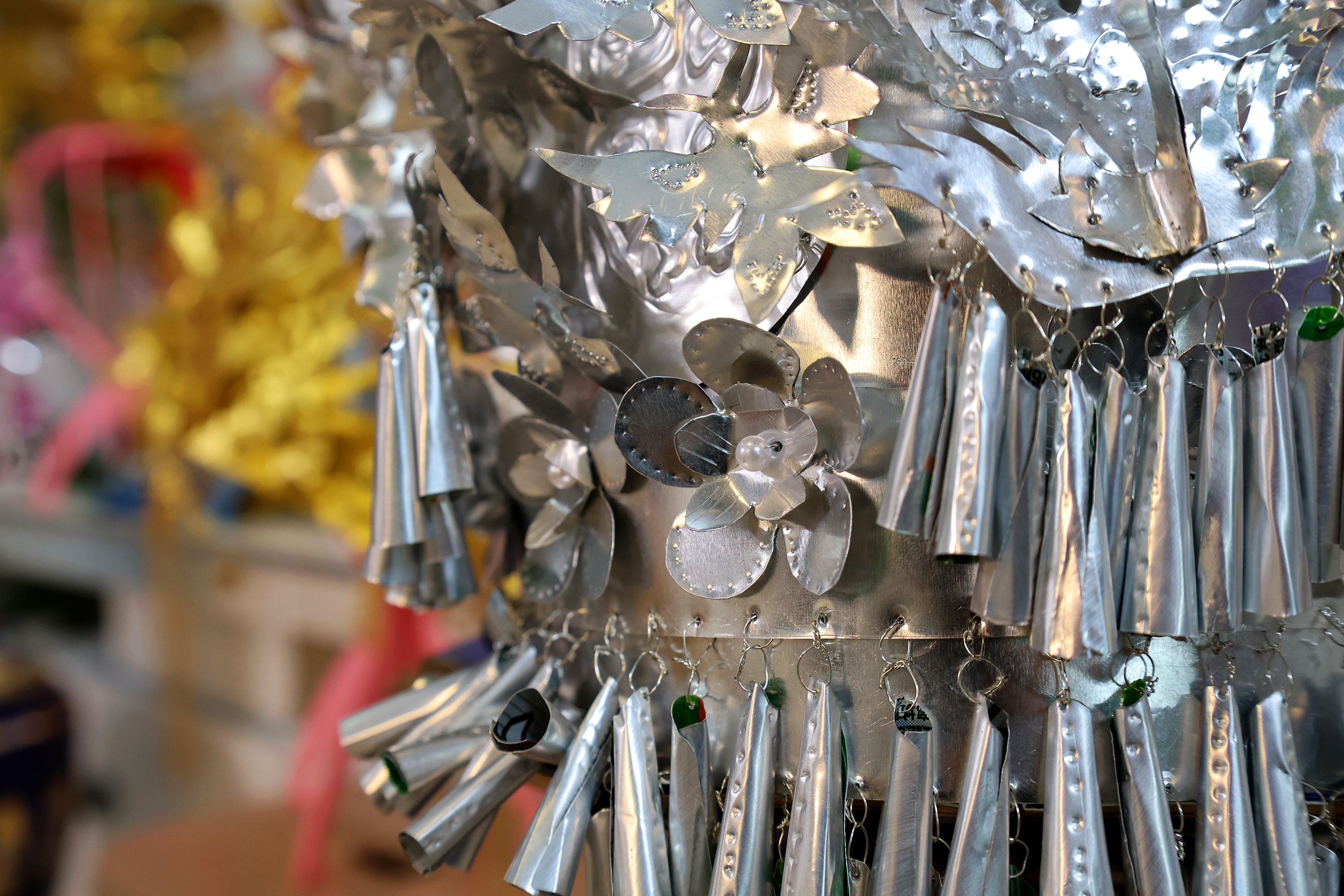 王媛嬌與易拉罐手工的緣分,始于去年5月的一次偶然。當時她整理陽臺,丈夫攢下的空易拉罐堆成小堆,正讓她犯愁時,12歲的女兒孫瑤冰念叨起《紅樓夢》里王熙鳳的鳳冠,一句“媽媽,這個鳳冠真好看”,讓自幼癡迷傳統元素、擅長繪畫的她動了心思:“女兒喜歡,我就試試做一個。”