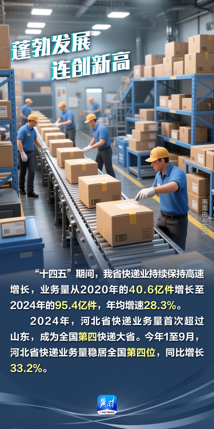 來源:冀時客戶端原標題:AI 海報 · 數說 “十四五”河北答卷丨小包裹加速跑!河北快遞業務量躍升為全國第四