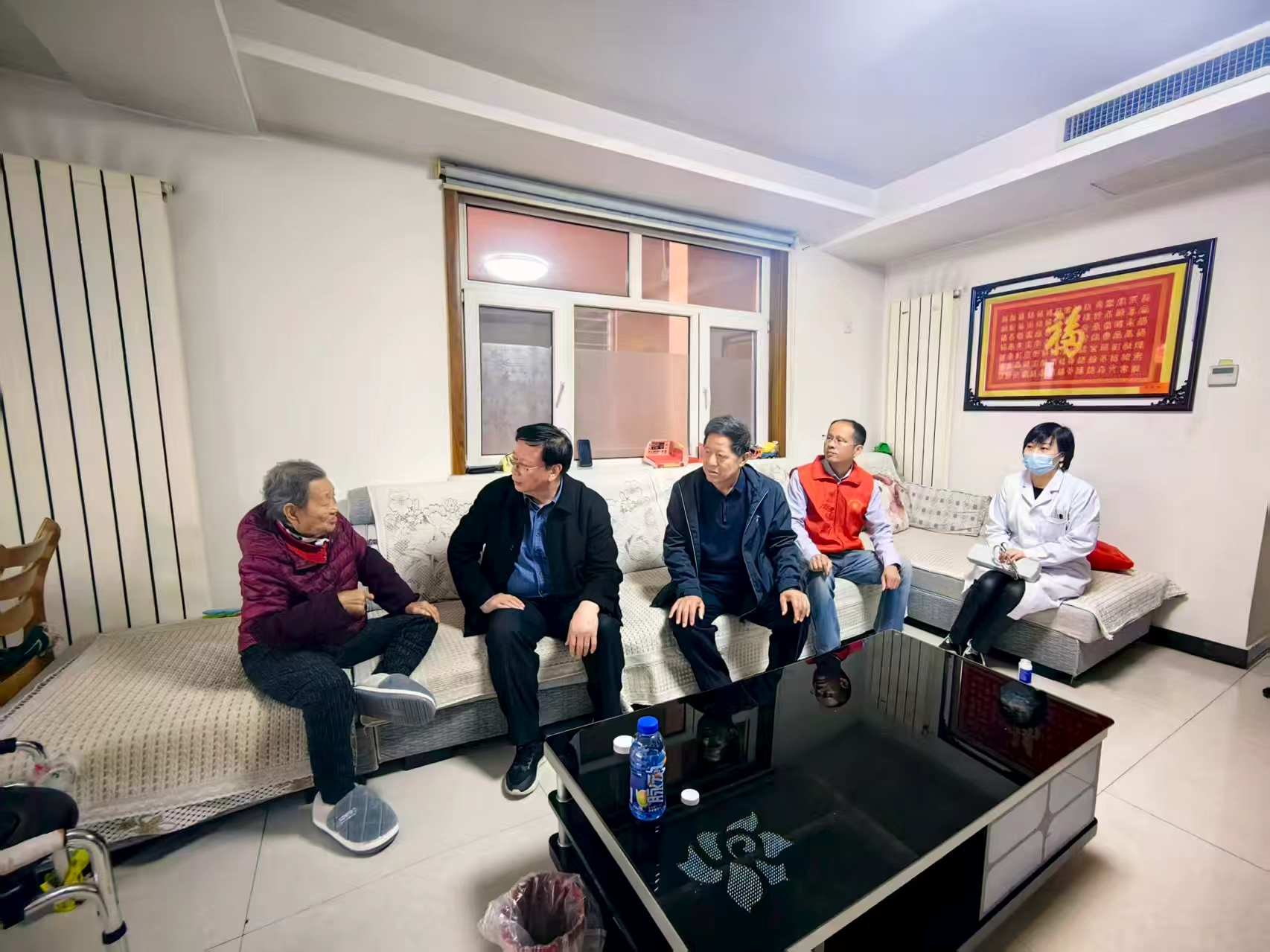 活動(dòng)當(dāng)日,潘國(guó)成院長(zhǎng)帶隊(duì),與醫(yī)護(hù)志愿者、市民政局工作人員組成慰問(wèn)隊(duì)伍,在社區(qū)工作者引導(dǎo)下,帶著米、面、食用油及應(yīng)季蠶絲被等實(shí)用物資,挨家挨戶走訪了轄區(qū)內(nèi)20余戶獨(dú)居老人家庭。