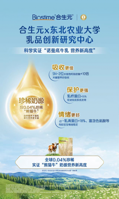 在深耕奶源品質的道路上,合生元還致力于深挖“熊貓牛”奶源的營養價值。近期,“乳品創新研究中心”首個諾曼底牛乳源研究成果在國際權威食品前沿雜志《Food Frontiers》重磅刊登。該研究顯示:“熊貓?!蹦淘碨N-2位脂肪含量高,SN-2位長鏈飽和脂肪酸相比荷斯坦牛高10倍,更接近母乳脂肪構成,更豐富的保護力成分如乳橋蛋白+55%,以及更多乳源活性成分如α-乳清蛋白,色氨酸等,這些成分與寶寶的免疫提升、情緒穩定有關?!靶茇埮!蹦淘囱芯砍晒粌H科學展示了諾曼底“熊貓牛”奶源的營養優勢,也推動了合生元奶粉在營養配方以及工藝上的不斷精進,持續突破品質天花板。