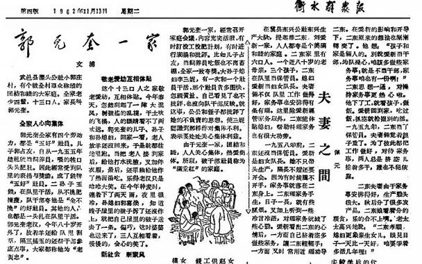 早在20世紀(jì)60年代,《衡水群眾報》就刊發(fā)過不少尊老敬老的報道——武邑縣圈頭公社小郭莊村有個大家庭敬老愛幼,被全村人稱頌。一次春季狂風(fēng)驟起,沙塵蔽日,“郭元奎的兒子、孫子和孫媳婦回家一看,老人放羊還沒回來,于是就都往地里跑。把老人接到家后,給他打水洗臉,又加件衣服,最后,還單獨(dú)給他做了熱面湯吃,樂得老漢只是哈哈大笑”(1962年11月13日《衡水群眾報》4版);俗話說,有個好兒子,不如有個好兒媳。冀縣新莊公社新莊大隊(duì)的孫蘭香自從嫁過門后,便與婆婆團(tuán)結(jié)和睦,“在外掙工分,在家擔(dān)水、做飯、喂豬、洗菜等搶著干,不讓婆婆受一點(diǎn)兒累”(1962年10月6日4版)。