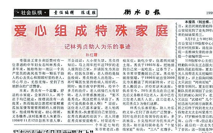 “老吾老以及人之老,幼吾幼以及人之幼”。《衡水日報》曾轉(zhuǎn)載《人民日報》報道,介紹北京東城區(qū)一對夫婦撫孤養(yǎng)老事跡,號召全社會樹立尊敬老人的社會主義道德風(fēng)尚(1979年3月1日4版)。棗強(qiáng)縣的林秀貞致富不忘眾鄉(xiāng)親,無私贍養(yǎng)了多位孤寡老人,她先后被授予“全國優(yōu)秀共產(chǎn)黨員”“全國三八紅旗手”“中國十大杰出母親”等榮譽(yù)稱號,獲評“全國道德模范”,讓孝老敬親的中華傳統(tǒng)美德得到升華。