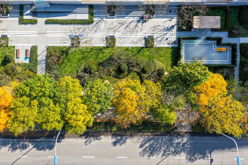 在口袋公園,少即是多,留白即是豐盈。干凈利落的幾何線條,勾勒出空間的節奏感,大片草坪與礫石鋪陳的“呼吸地帶”,讓視線與心境一同舒展。植物不再是點綴,而是空間的情緒——形態鮮明的喬木、成團簇擁的灌木,以克制而精準的方式,構筑出寧靜而有生命力的背景。