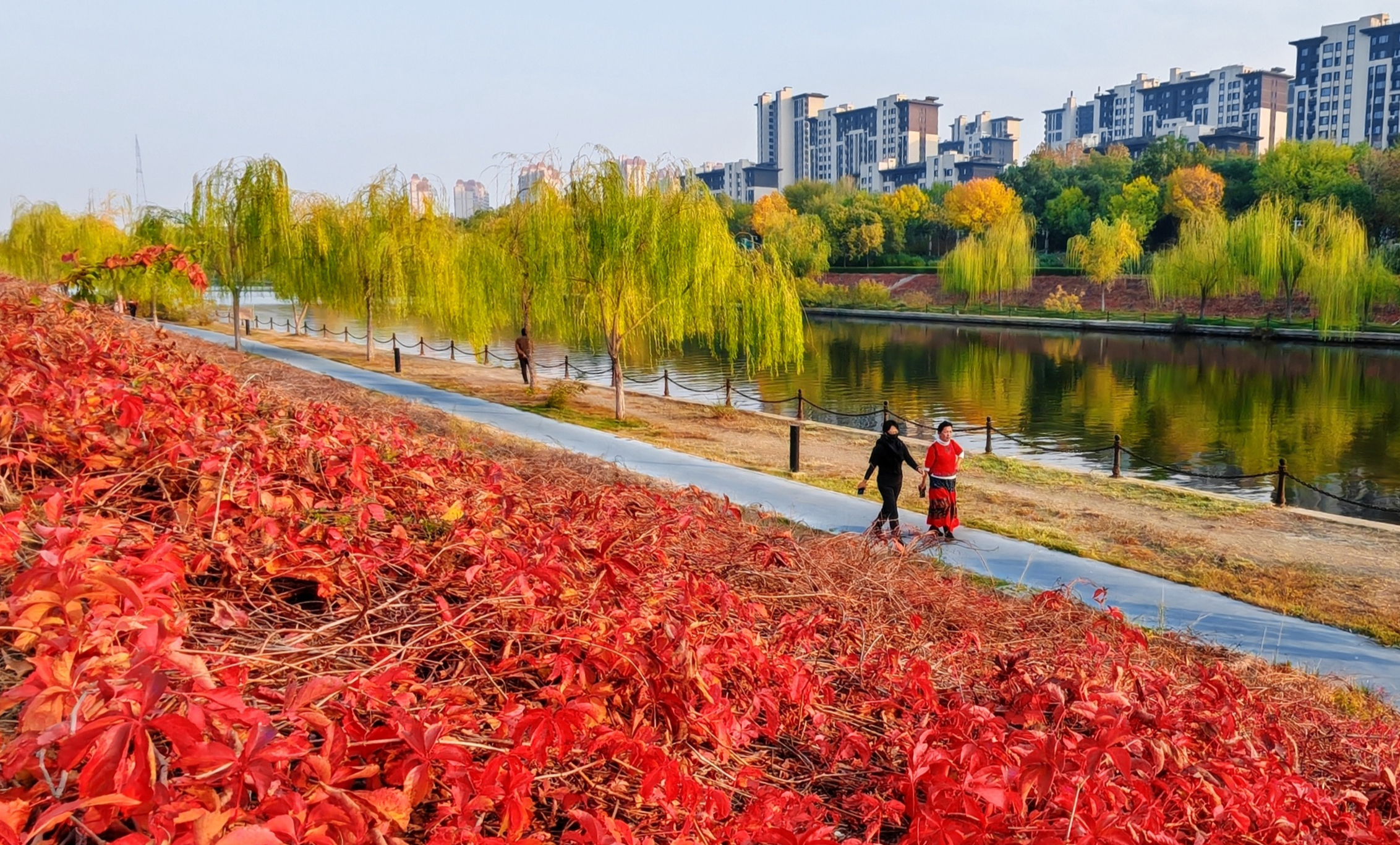 市民沿親水平臺駐足,或賞水面倒影,或觀魚蝦游弋,沉浸式感受秋河之美。岸邊金柳垂絲輕拂水面,爬山虎的艷紅與白蠟的金黃倒映河中,形成“人在景中走”的詩意畫面。