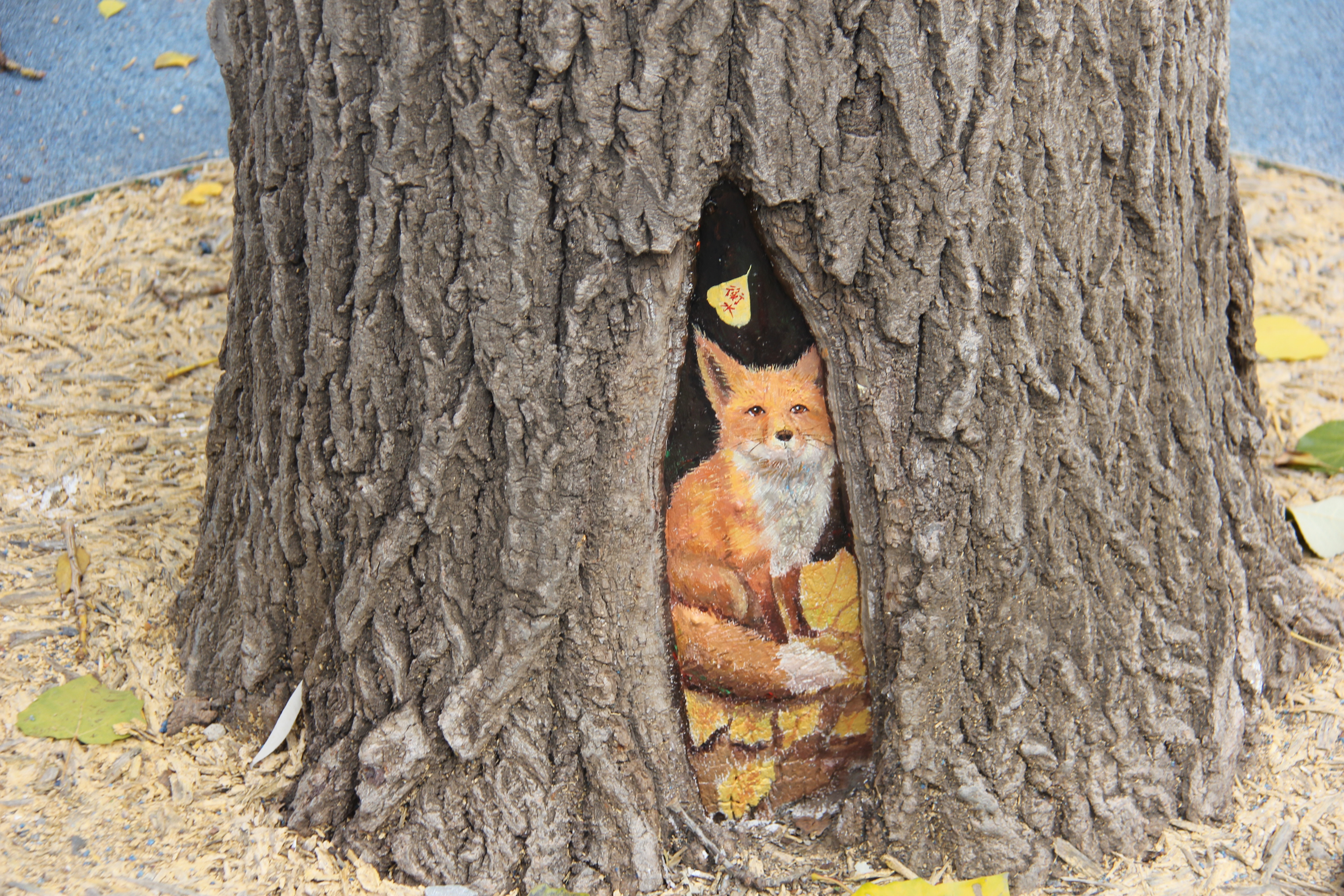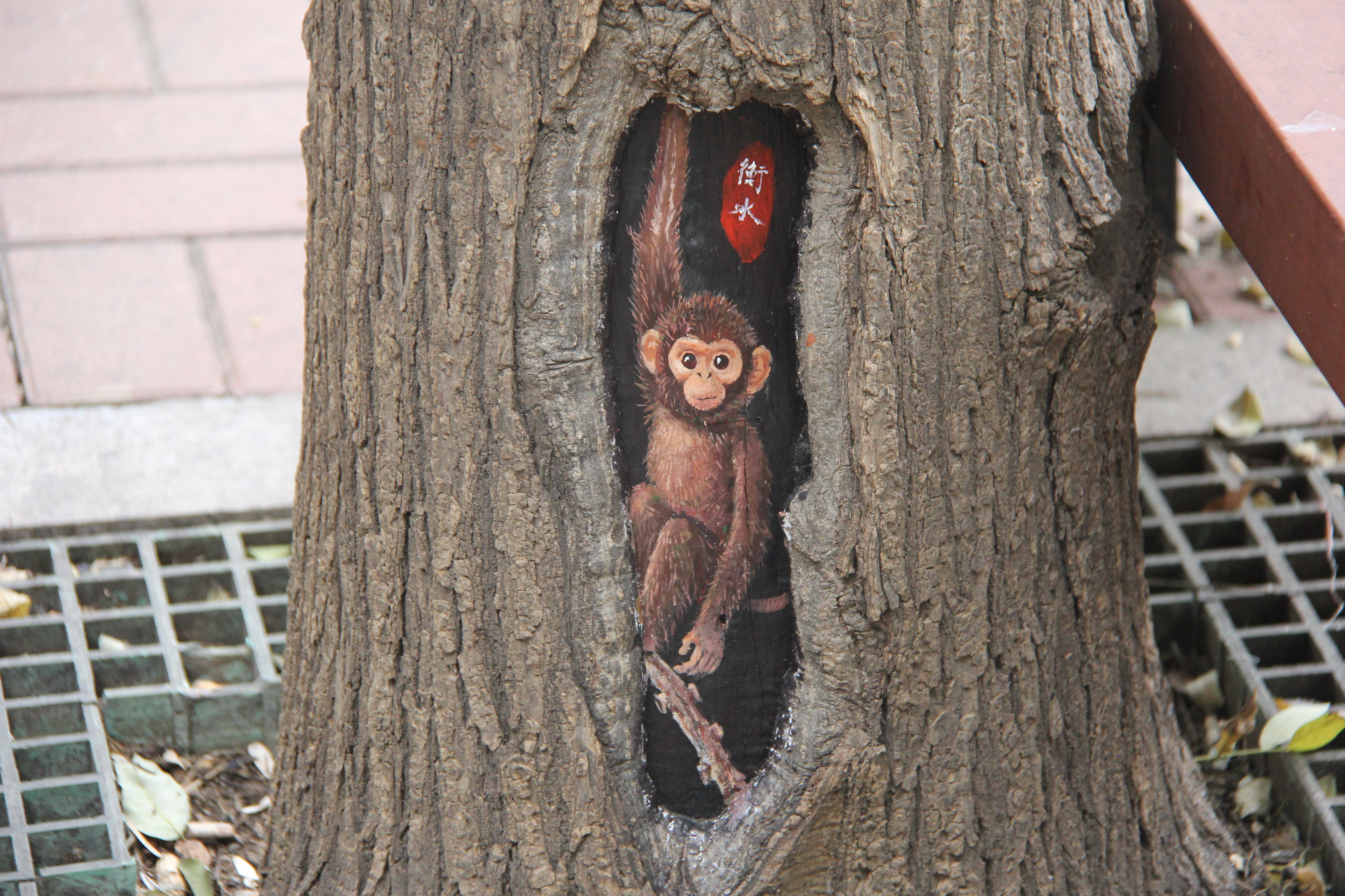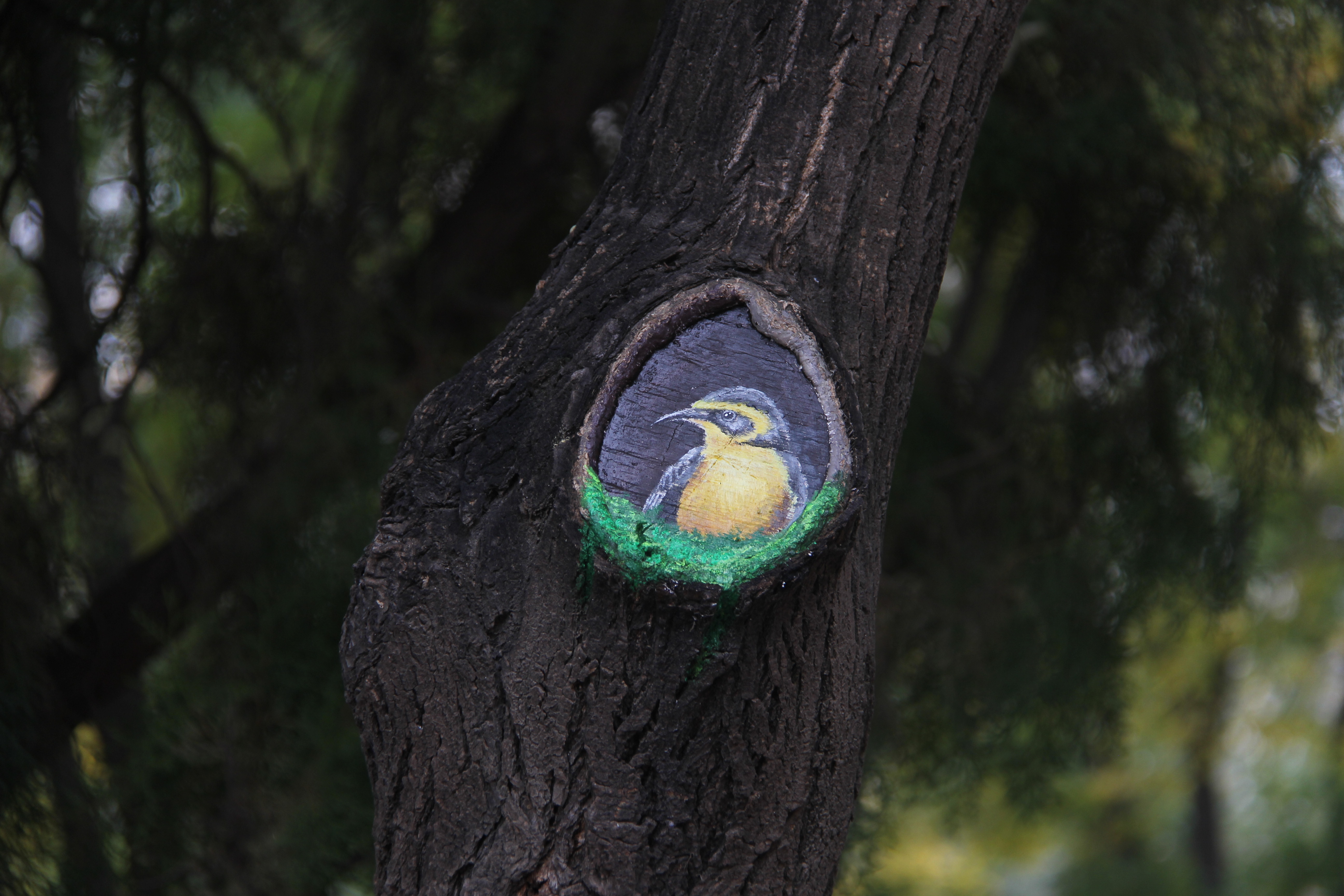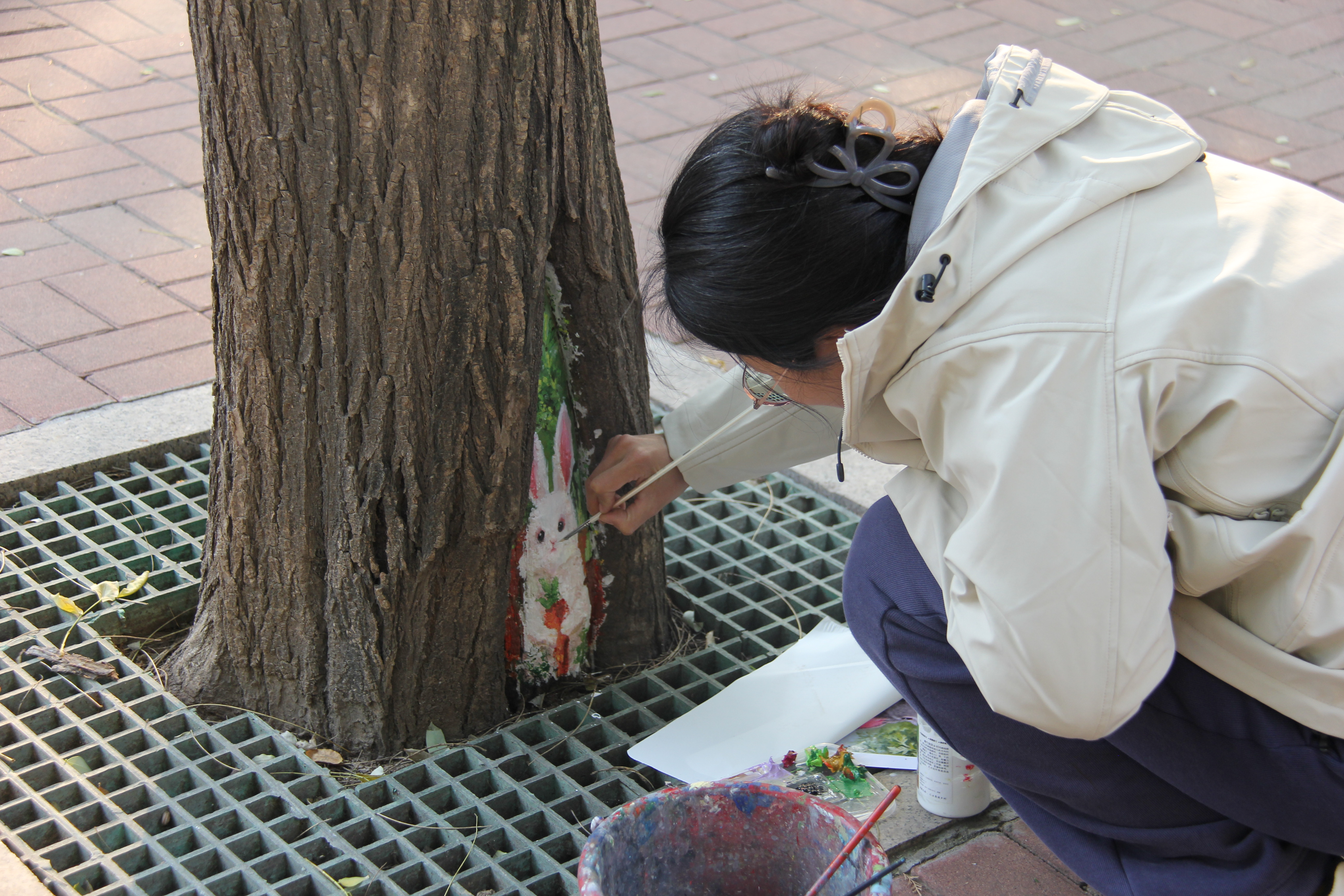 除了這只“小雞”,小鸚鵡、小狐貍等形象也紛紛“藏身”樹洞,不少人停下腳步,拍照欣賞。不遠(yuǎn)處,志愿者們正俯身執(zhí)筆,讓原本沉寂的樹洞煥發(fā)出藝術(shù)的溫度,讓這里的樹洞成為市民逛街時的意外驚喜。志愿者王若昀說:“一些樹木因年久或外力因素形成了大小不一的樹洞,我們希望讓這些‘受傷’的樹木重新煥發(fā)生機(jī)!”