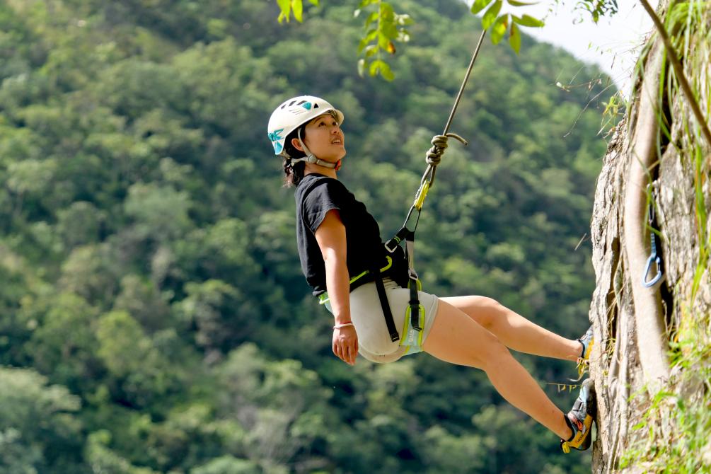 ??10月4日,游客在云南大理南澗彝族自治縣公郎鎮猛龍渡體驗“攀巖”運動。新華社發(適志宏 攝)