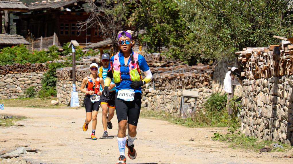 ??9月27日,首屆巴松措山地越野跑在西藏林芝市工布江達縣巴松措風景區舉行,圖為參賽選手穿過古村落錯高村。新華社記者 格桑朗杰 攝