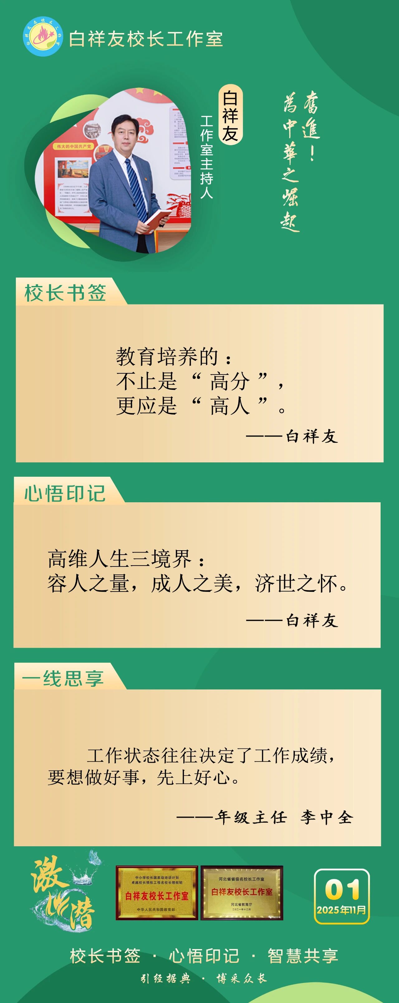 “白祥友校長工作室”成立于2019年4月,是教育部“國培計劃”中小學名校長領航工程、河北省首批名校長工作室,目前省內外成員校59所。工作室堅持“資源共享、智慧共融、互助共贏”理念,已成為思想碰撞的交流場,資源共享的品牌站,成果展示的輻射源。