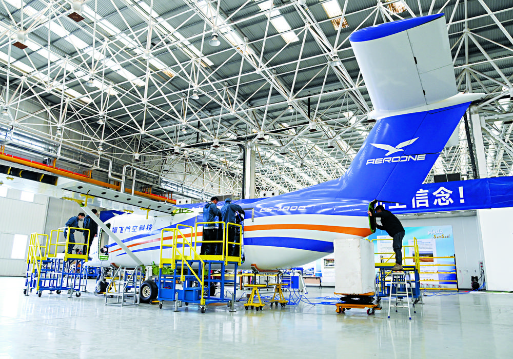 在位于石家莊裝備制造產業園的翊飛航空科技(石家莊)有限公司,工作人員在進行大型無人運輸機的研發。