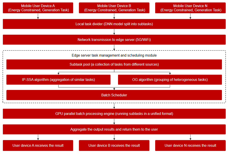 但傳統卸載方案通常針對單用戶場景,未充分考慮多個用戶共享邊緣服務器資源時的任務調度與負載均衡問題。在真實世界中,邊緣服務器往往要同時響應數十、甚至數百個終端設備的推理請求。在這種多用戶同時在線的場景下,如何高效地調度任務,最大限度地提升GPU并行計算能力,并在保障各用戶延遲需求的同時最小化整體能耗,成為亟需解決的問題。